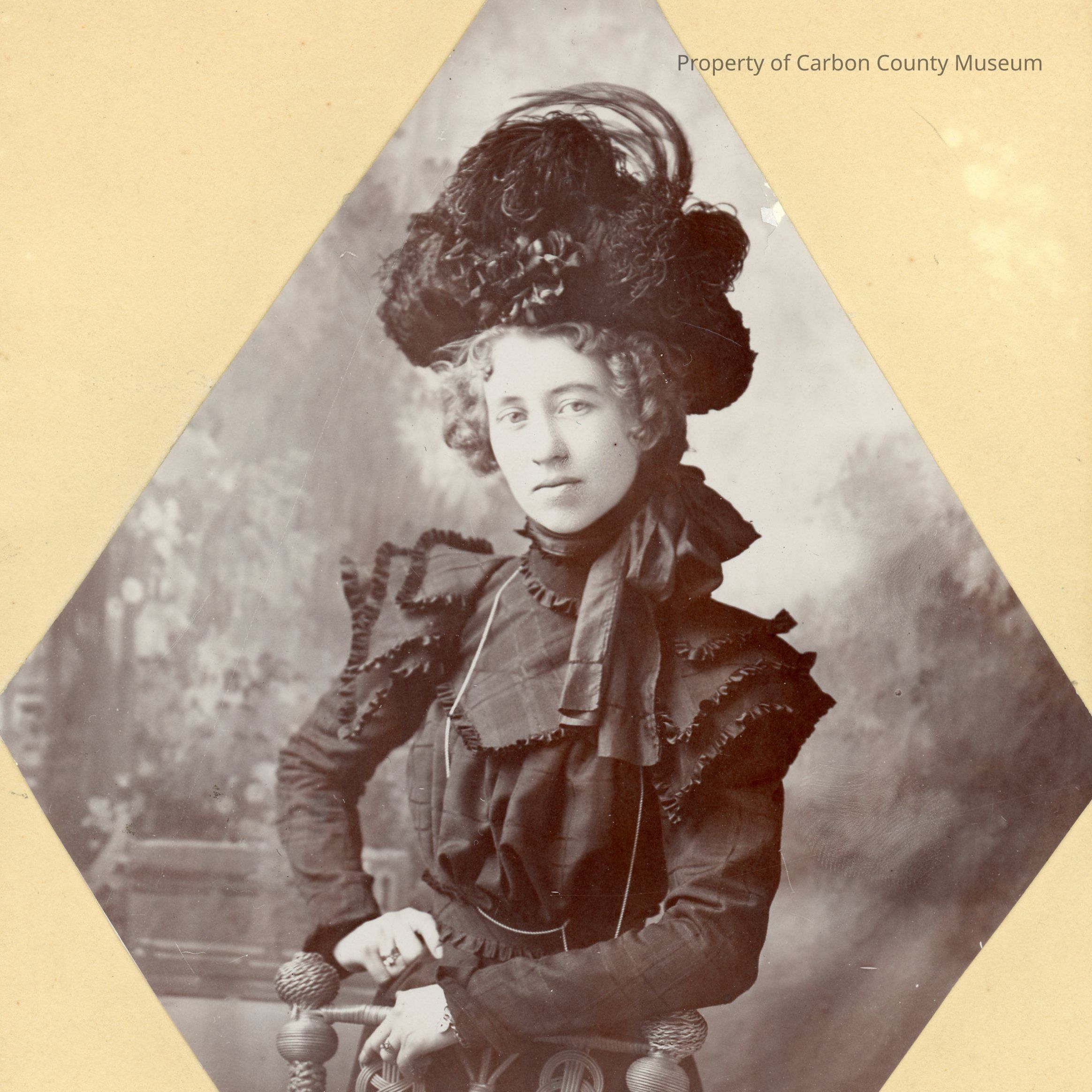 Update 2009: Black and white studio portrait. Mounted on tan matboard, diamond shaped. 3/4 length portrait of a woman dressed in black. She is standing behind an ornate wicker chair with her left arm resting on back; her right hand is on her right hip. She is wearing a dark dress with layered and frilled shoulders, long sleeves, high collar, and blousy bodice. She has a large dark hat on her had with bows and ostrich plumes-tied under chin with large bow at left neck. Her hair is very curly-appears to be pinned up. Painted backdrop behind.