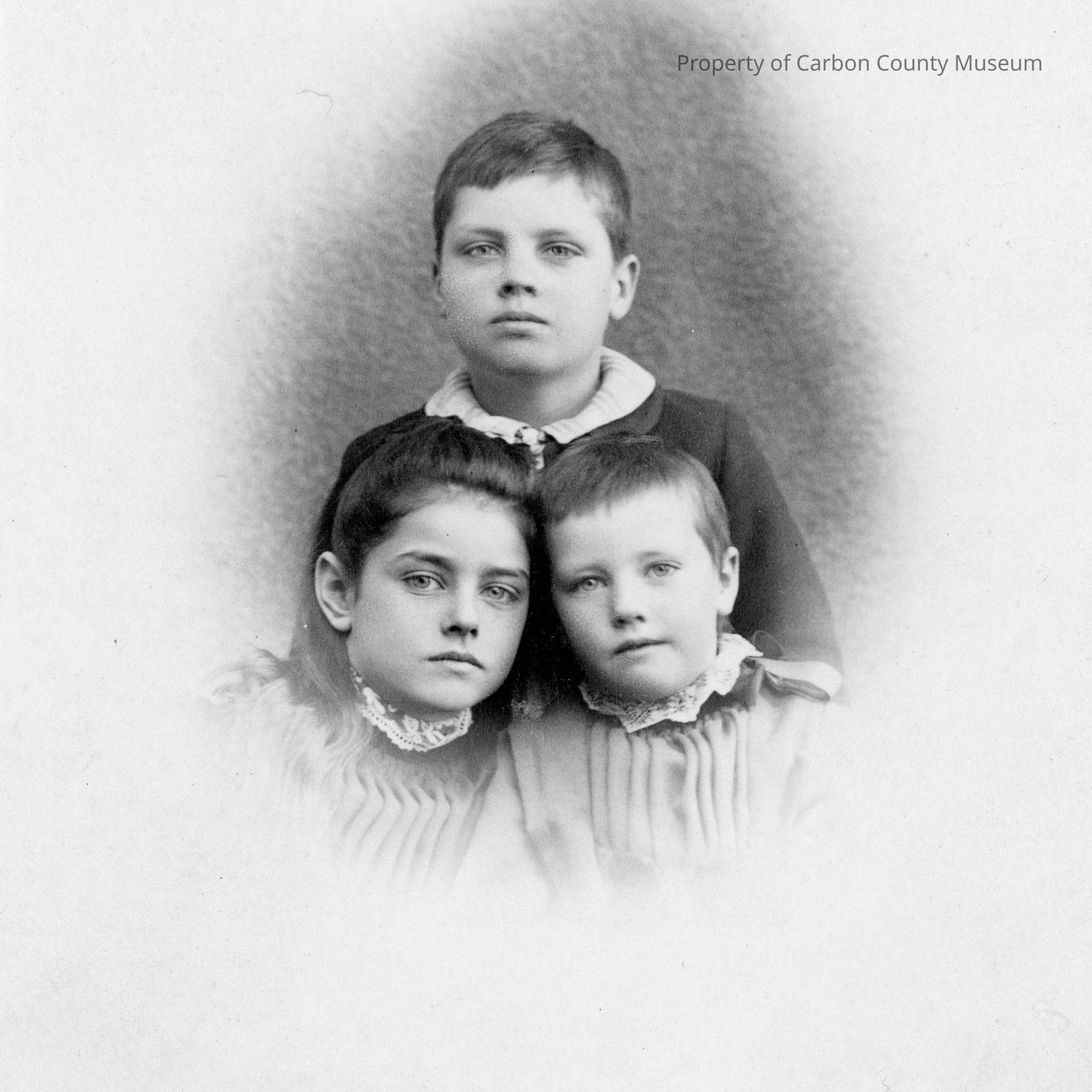 Update 2009: Black and white studio portrait. Mounted on tan matboard. head and shoulders portrait of three children posed in a triangular pattern-two in front and below and one behind and above. Image feathers out on the sides. Child above is a young boy-he is dressed in a dark jacket with the white striped collar of his shirt pulled out over the neck. Two children in front are girls-one older, one younger. They are dressed identically in light dress/blouse with pleated bodice and white lace collars.