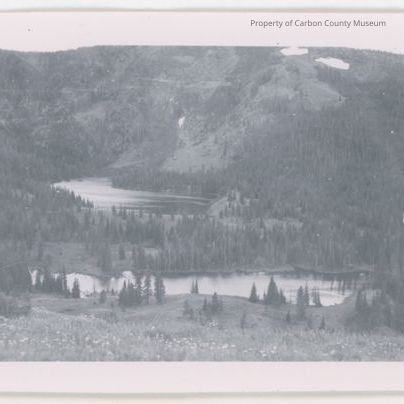 Black and white print. Image from elevation of two mountain lakes nestled at the foot of a forested rocky mountain, forested shorelines. Meadow with flowers in foreground. Small patches of snow on mountain.
