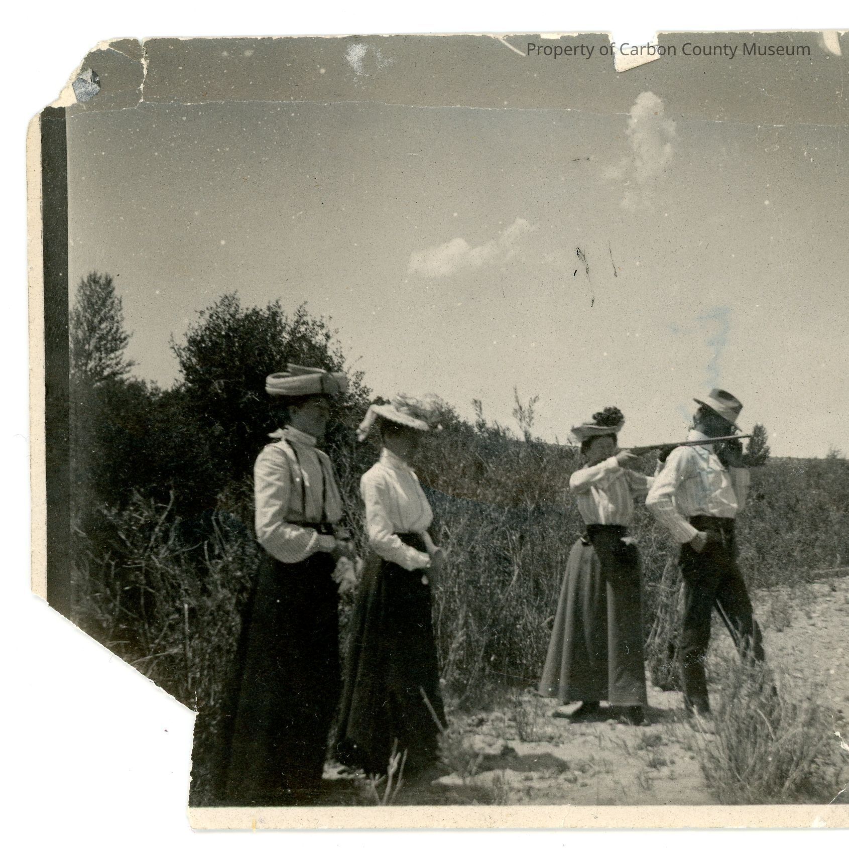 Update - 2009: Black & white snapshot. Image of three women & one man standing in front of a row of tall bushes. One woman is holding & aiming a rifle which is resting on the man's shoulder. Women are in dark skirts, light-colored, long sleeved blouses & hats. Man is in dark slacks & boots, light-colored striped shirt & hat.