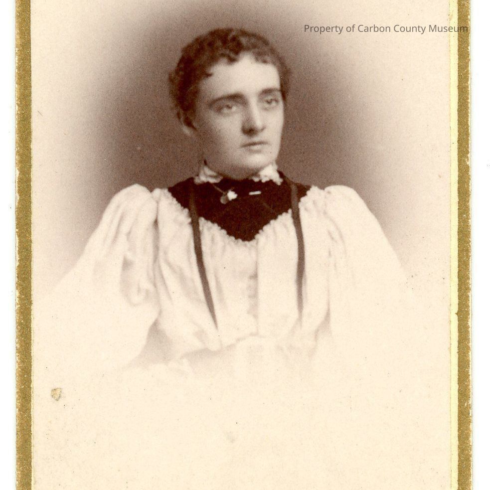 Update - 2009: Black & white studio portrait. Mounted on tan matboard with gild edge. Half length portrait of woman in a blousy white dress with dark yolk & white lacy collar. Appears to be a dark ribbon hanging around neck & down front. Stick pin at throat.