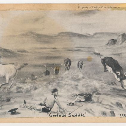 Printed on back of card at top left: "From original painting by J.W. Benson, Cowboy Artist. " On top right side:" Postcard" "Stamp" "Address" Printed through middle center of care: "Benson-Russell Postcard Service, Gillette, Wyo."Collection