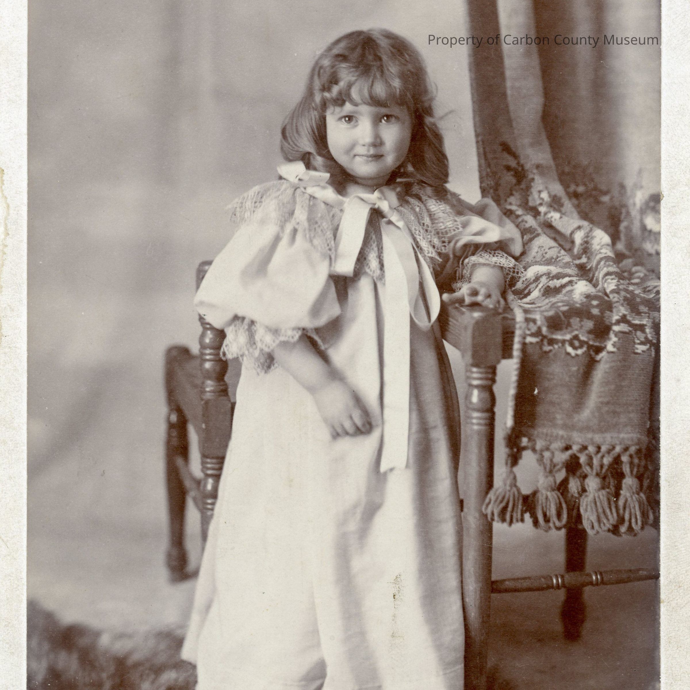 Update - 2009: Black & white studio portrait. Mounted on off-white matboard. Full length portrait of a young girl dressed in a floor length, 3/4 sleeve sack dress with lace accents at collar & cuffs; large bows at neck & shoulders. She is standing with her left arm resting on a wood table(?) that is hidden behind a heavy hanging curtain. Painted backdrop behind & fur underfoot. Her hair is loose & curled.