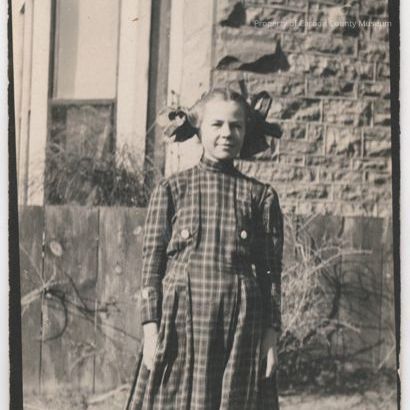 Update 1/2008: A black and white contract print of Gladys Buchanan Niland, Rawlins, Wy. as a young girl. She is wearing a plaid dress with high neck, long sleeves and mid calf length. The dress has large white button accents-one on each side of front bodice and one on right sleeve at lower left edge. She is wearing dark long socks. Her hair is center parted and gathered at back with large decorative bow. She is standing outside with a wide-board, wooden fence behind her with a few dormant bushes visible. A partially viewed sandstone house with tall linear windows is in far background.