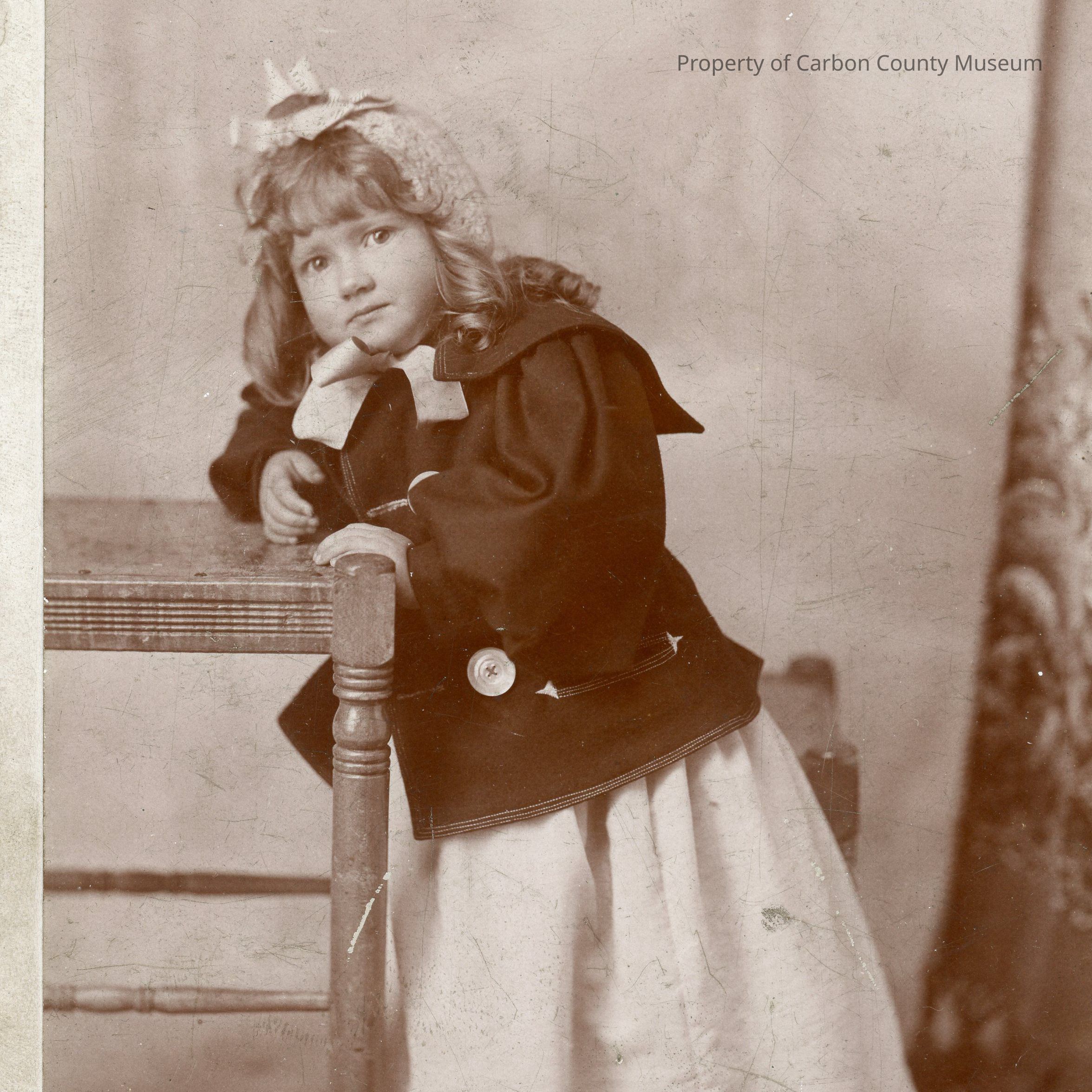 Update - 2009: Sepia-Studio portrait. Mounted on off-white matboard. Full length portrait of a young girl standing & leaning forward against a wood table. She is wearing a floor length, light colored dress, dark jacket & knit hat tied with a wide ribbon under chin. Her hair is loose & curled in ringlets. Painted backdrop behind; fur underfoot.