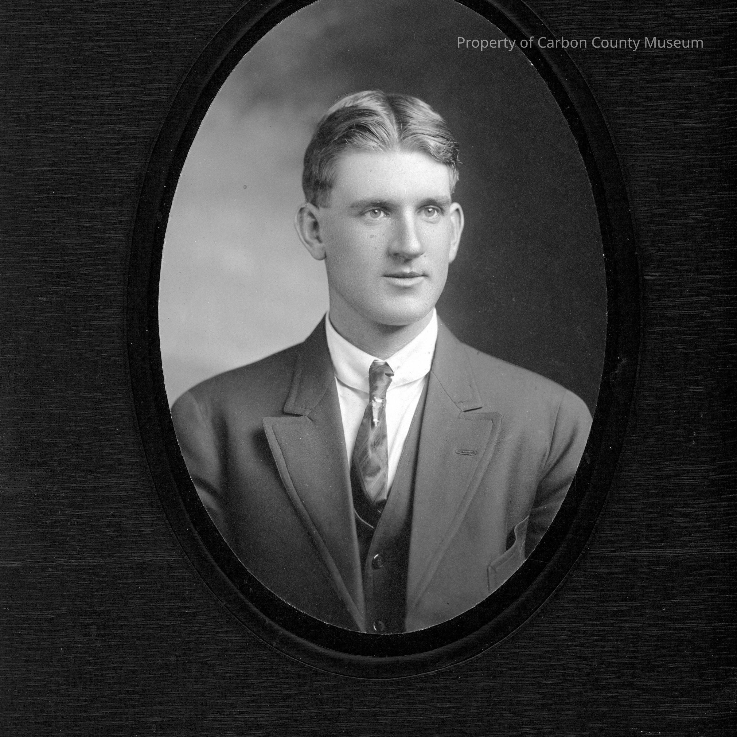 Update - 2009: Black & white studio portrait & one scanned copy. Mounted on black matboard. Oval head & shoulders portrait of a young man dressed in a 3-piece dark suit, dark patterned tie & white shirt. He is clean shaven & has a center part in his short hair. He has an arrowhead tie tack in the tie just below the knot.