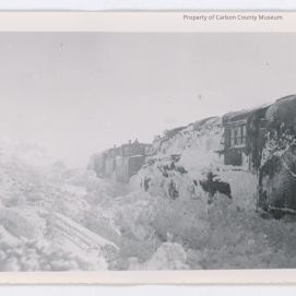 Black and white print. Snapshot. Image of a snow-bound train that has been partially extricated from a huge drift. Telephone/power poles in background at left. Appears to be another train moving toward the stuck train, in background. Blizzard of 1949.