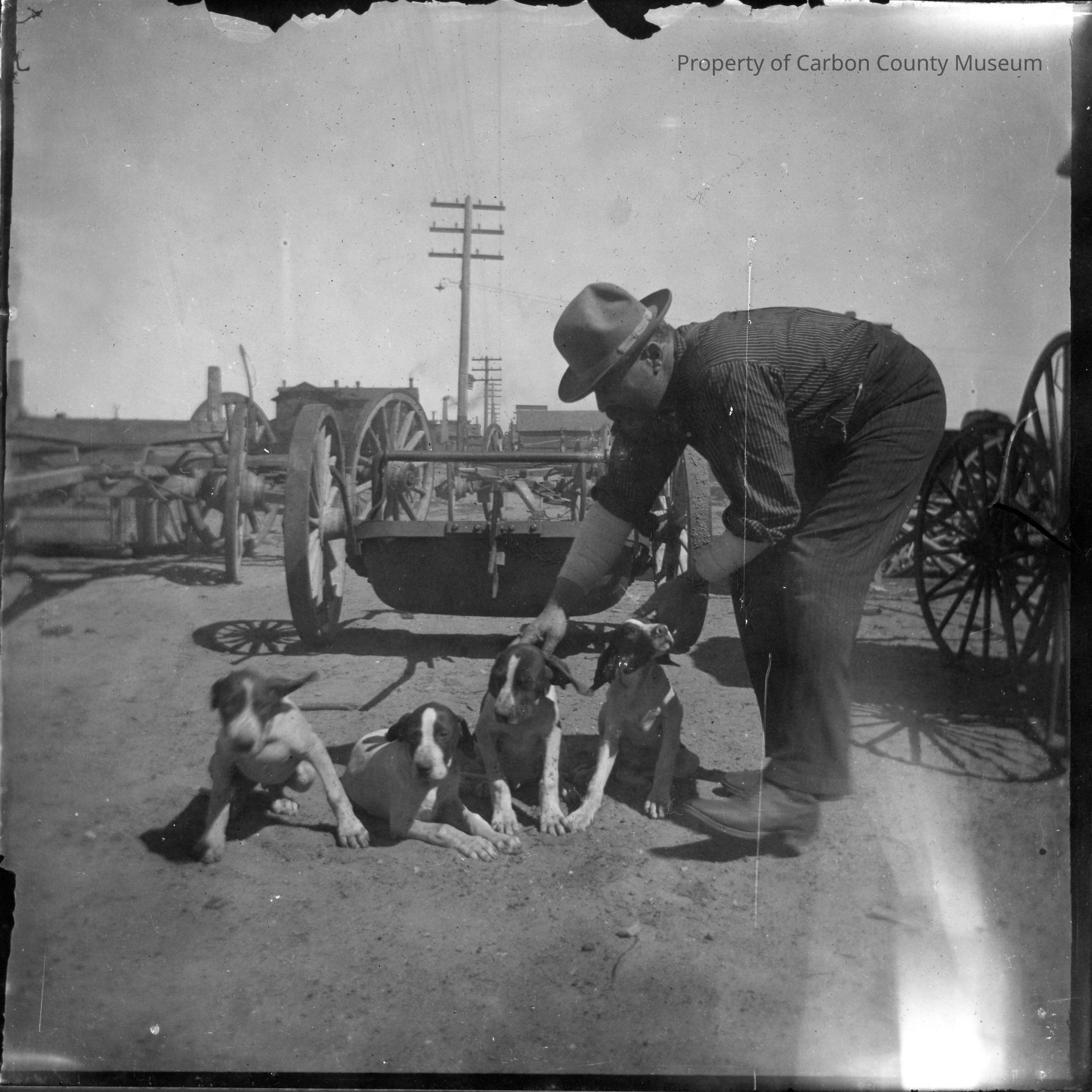 Image of a man leaning down to pet one of four dogs sitting & lying on a dirt yard. Wagons & machinery, three-tiered telephone pole & buildings in background. Man is dressed in dark work clothes, hat & boots. Dogs are white with white & dark colored faces; dog at left appears to be in the process of standing up.