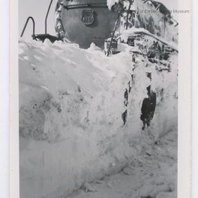 Black and white print. Snapshot. Image of a partially extricated snow-bound Union Pacific train engine "3932". Snow is up to mid-carriage in front of engine. Blizzard of 1949.