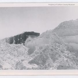 Black and white print. Snapshot. Image of a snowbound train, partially extricated from a towering snowdrift. Two box cars visible. Blizzard of 1949.