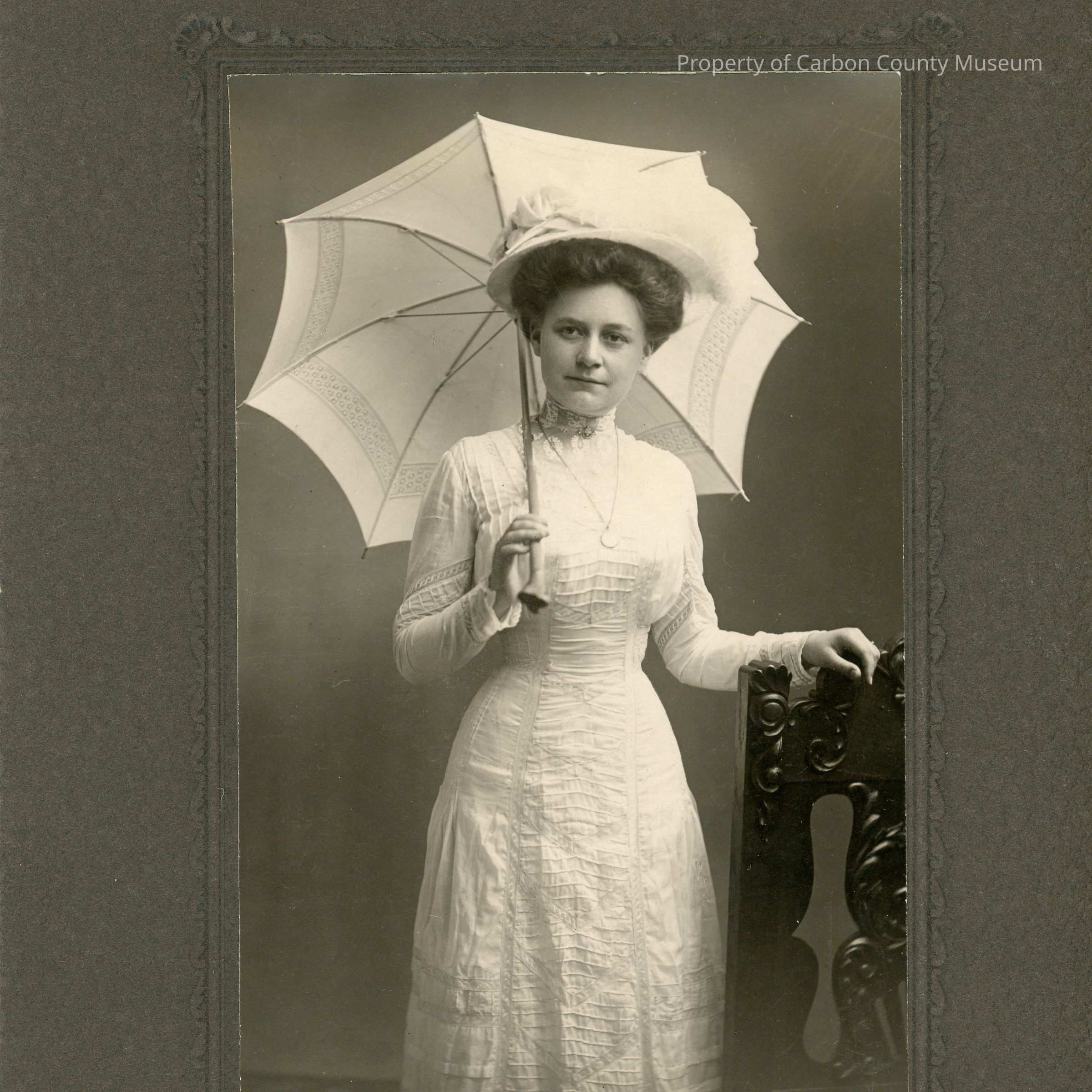 Update - 2009: Black & white print. Studio portrait mounted on brown matboard with embossed curvilinear frame around image. 3/4 length portrait of a woman wearing long, long-sleeved white dress with high lace collar. She is holding an open white parasol & is wearing a large white hat with ostrich plume. she is standing next to an ornately carved wooden chair & has her left hand resting on the back.