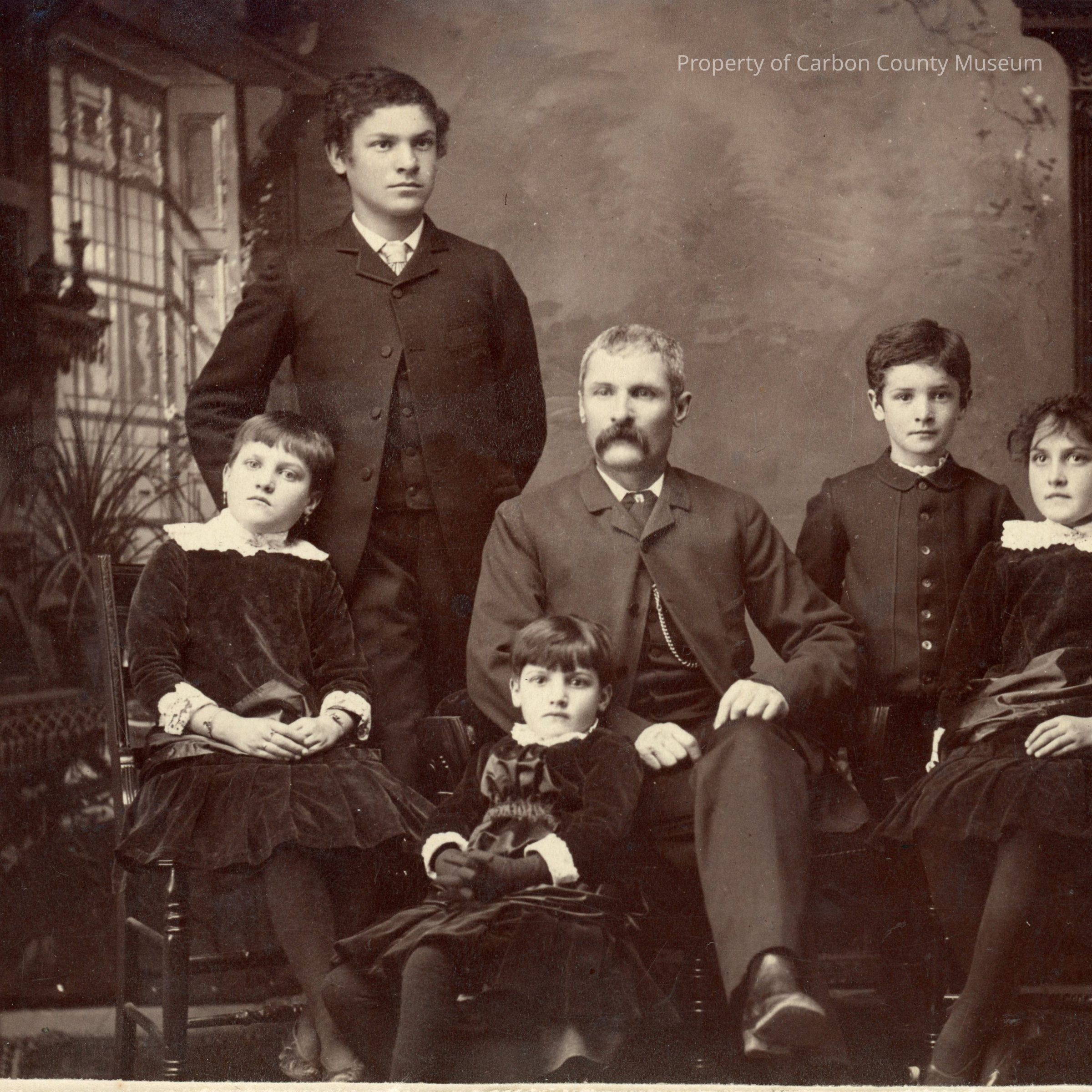 Update - 2009: Black & white print. Studio portrait. Mounted on off-white matboard with gild edge. Full length portrait of a man & five children seated & standing in front of an ornate painted backdrop with window & door included. Three girls are dressed in dark velvet dresses with lace collars & cuffs. Young boy standing at man's left shoulder is wearing a dark jacket buttoned to collar. Older boy standing at man's right shoulder is wearing a dark 3-piece suit, light tie & white shirt. Man is seated at center & is dressed in a dark 3-piece suit, dark tie & white shirt; he has light short hair & a dark mustache.