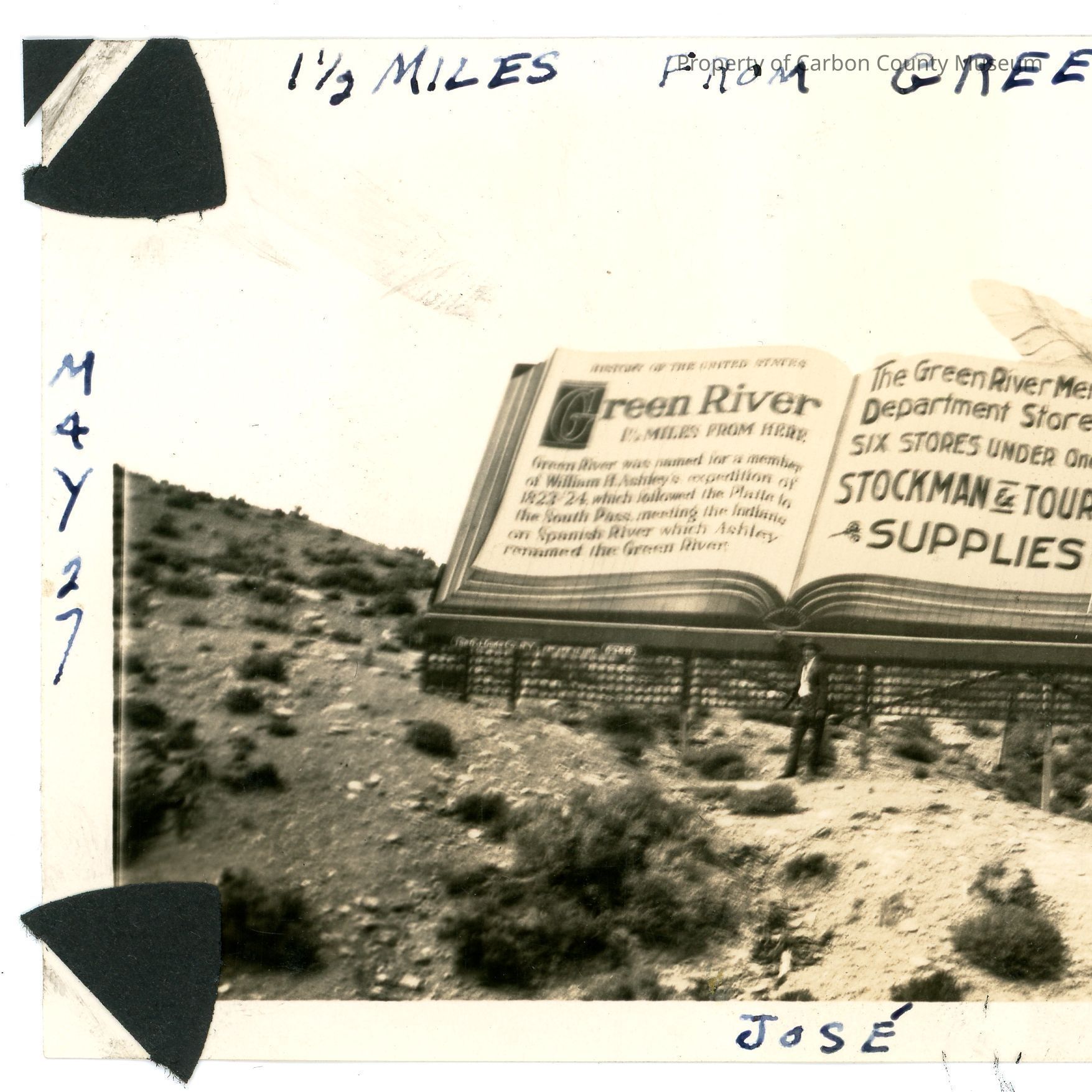 Black and white photograph. A large billboard styled to look like an open book is advertising the Green River Mercantile Department Store Com., a smaller board made to look like a feather pen and ink well advertises gas and oil. There is a man standing in front of the billboard. Written along the top edge of the photograph is "1 1/2 MILES FROM GREEN RIVER", along the bottom "JOSE", vertically along the left "MAY 27", vertically along the right "1928". The number 38 is printed on the reverse.Collection