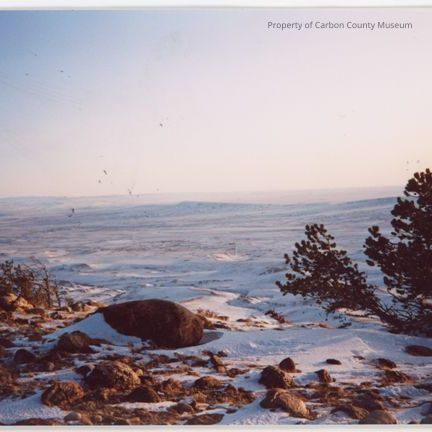 Color print. Snapshot. Image of snow-covered plains and hills from top of a high peak. Snow-covered rocky ground and scraggily trees in foreground.