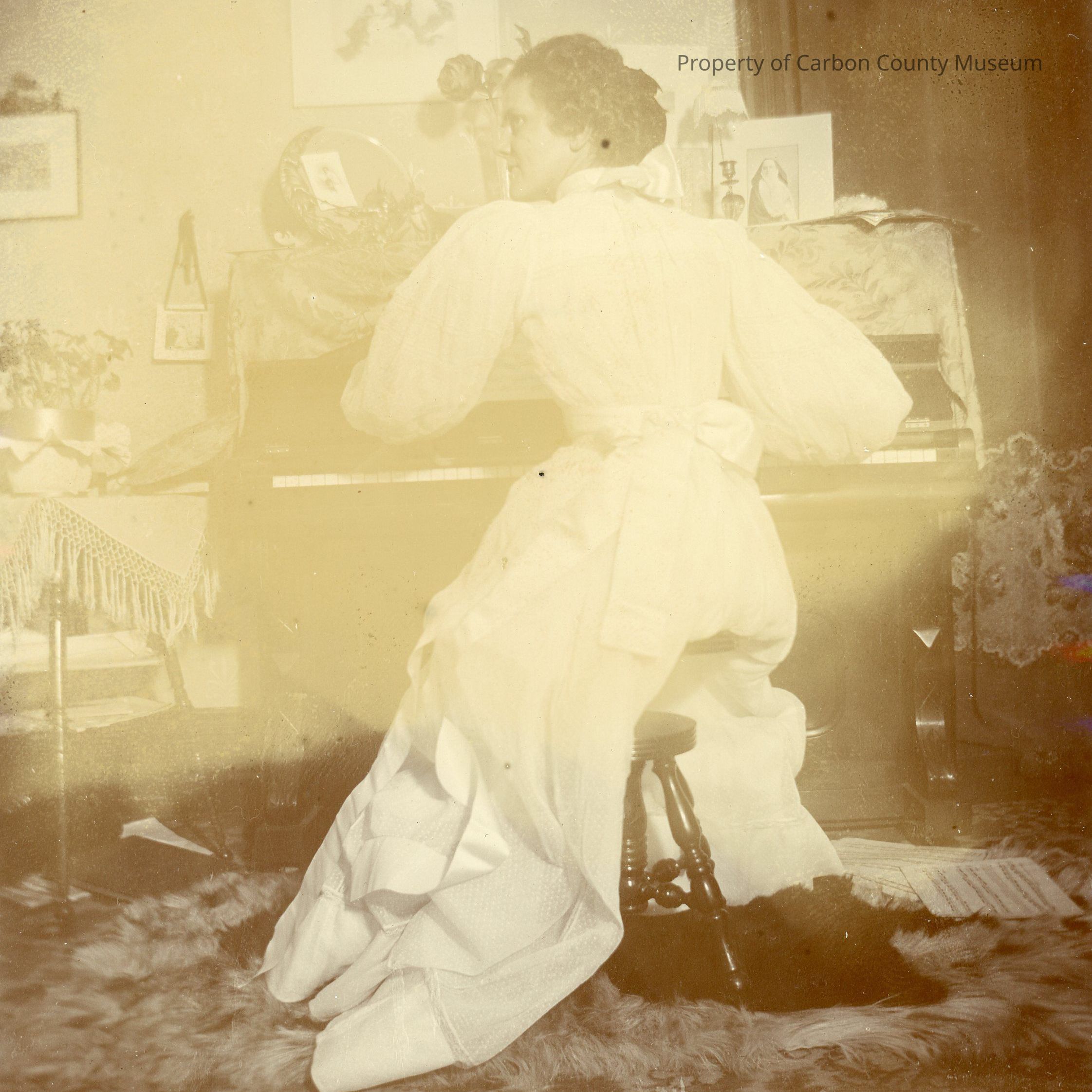 Update - 2009: Black & white print. Snapshot. Made from glass plate negative. Image of a woman wearing a long, long-sleeved white dress, seated at a small upright piano. Her back is to the camera & she is looking to her left. Her hair is pinned up. There are furs & sheet music on the floor around her. Cloth covering, photos & knickknacks on top of the piano; table with fringed covering & flowers at left.