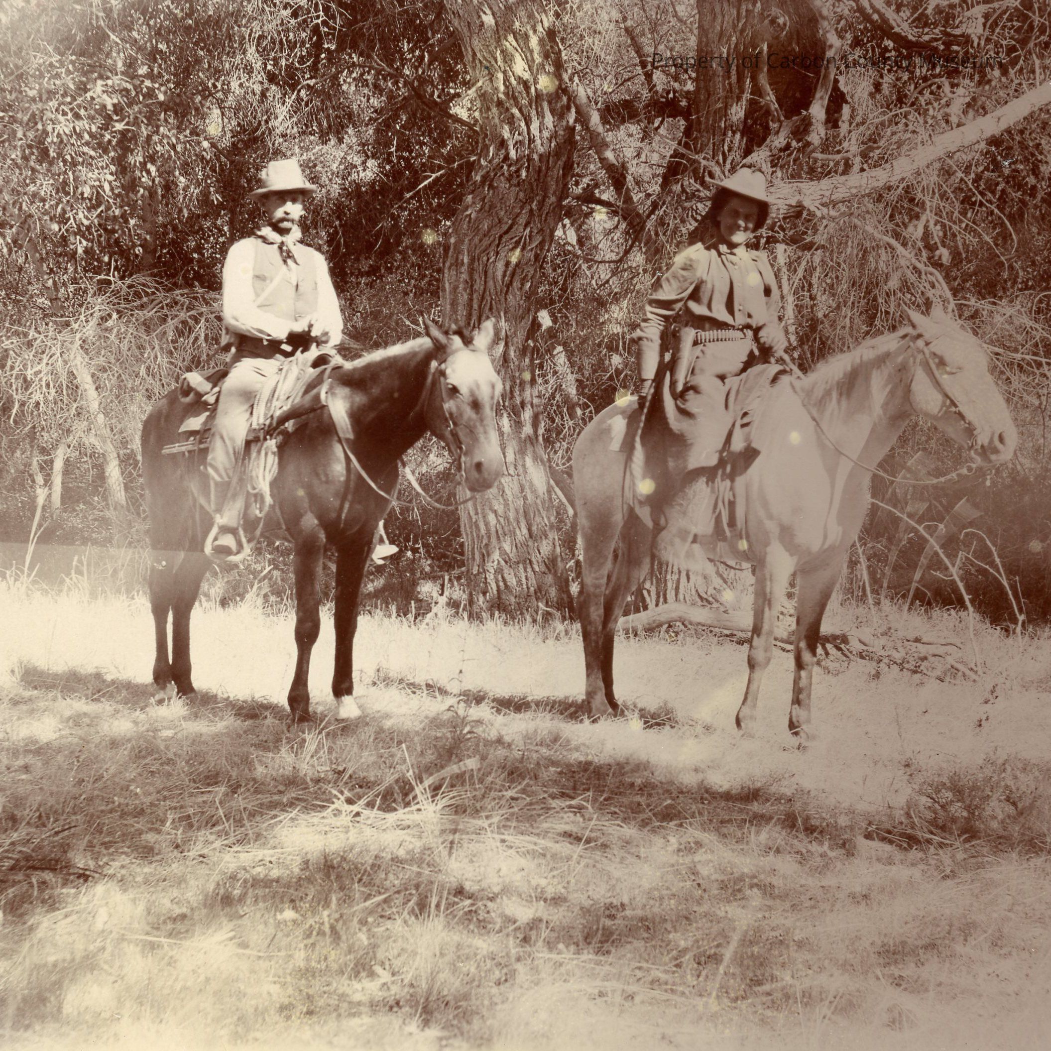 Update - 2009: Black & white print. Snapshot. Made from glass plate negative. Image of a man & woman on horseback posed on open ground in front of a grove of trees. Woman at right is wearing medium-colored long-sleeve blouse & skirt. She is wearing a hat & holstered pistol with cartridge belt; she is sitting astride the horse. Man, at left, is casually dressed in light-colored pants & vest & white long sleeve shirt, bandanna & hat; he has a rifle straped to the side of his saddle; he has a mustache.
