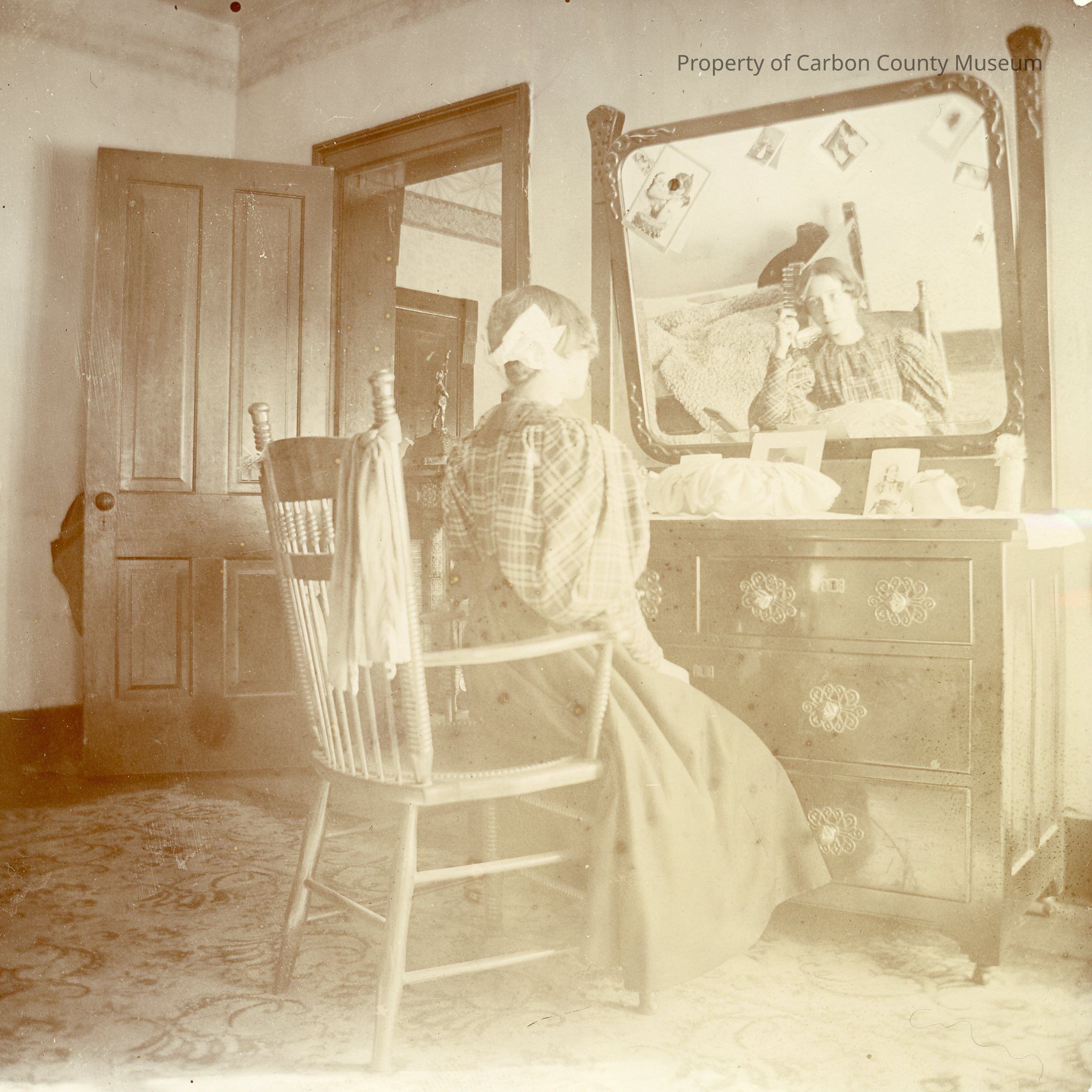 Update - 2009: Black & white print. Snapshot. Made from glass plate negative. Image of a woman seated in a wooden arm chair in front of a dresser & mirror. She is dressed in a light-colored long skirt & plaid blouse with leg-of-mutton sleeves. Her hair is pinned up with a white bow, but she appears to be combing or curling the left side. Open door to left.