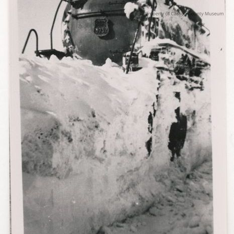 Black and white glossy reprint 3 5/8 x 5 of a Union Pacific train engine's lower wheels and parts encapsulated in a huge deep cut of snow. The number 3932 is on the trains center logo. There is a plowed area to train's right in foreground. This is a scene from blizzard of 1949.