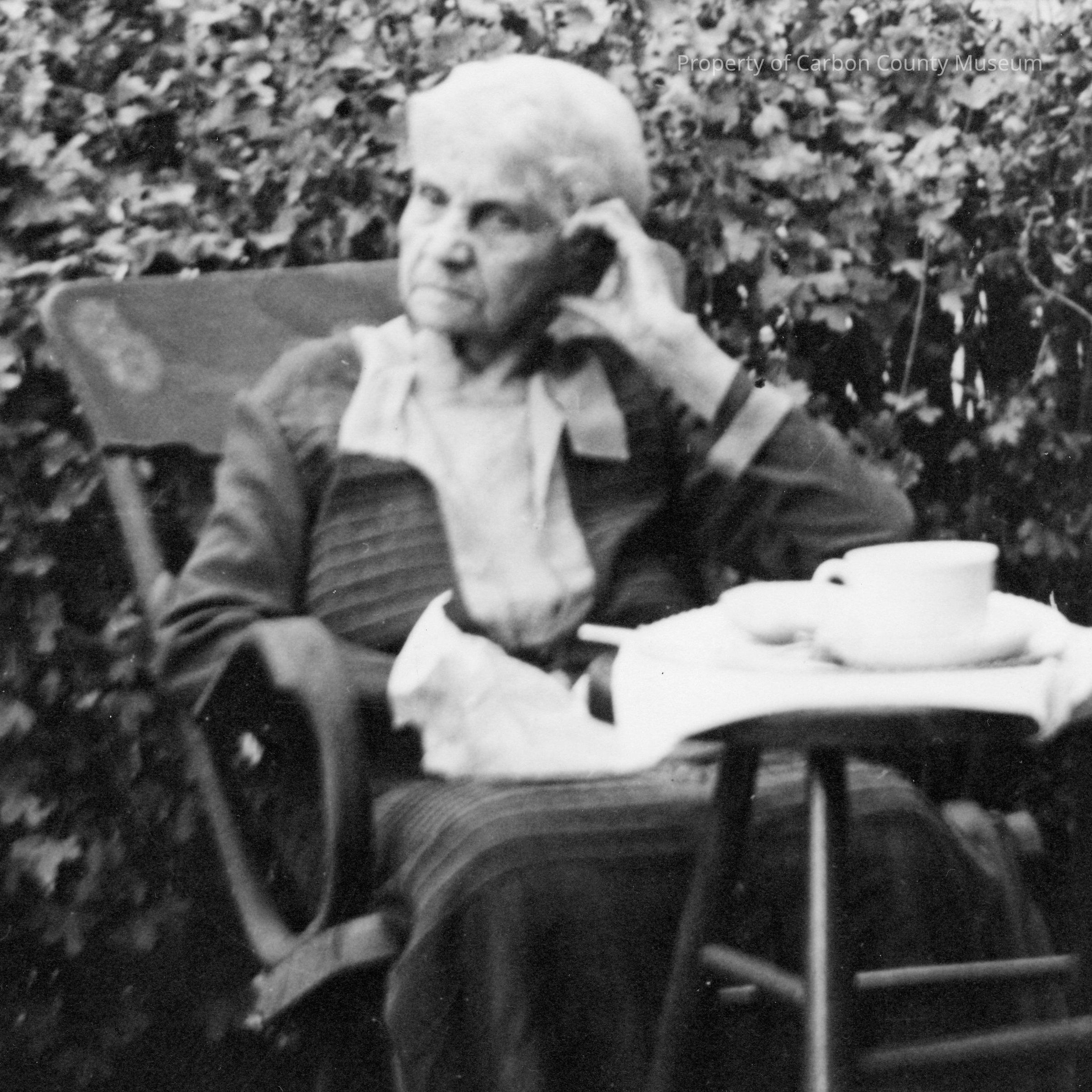 Update - 2009: Black & white print. Snapshot. Image of an older woman sitting in a wooden rocker outside on a lawn. Hedge or vines & clapboard house in background. wooden bar stool with cloth & large coffee mug in front of chair. Woman is wearing a dark patterned weave dress with light collar & bodice insert. Her left hand is resting on the side of her head.