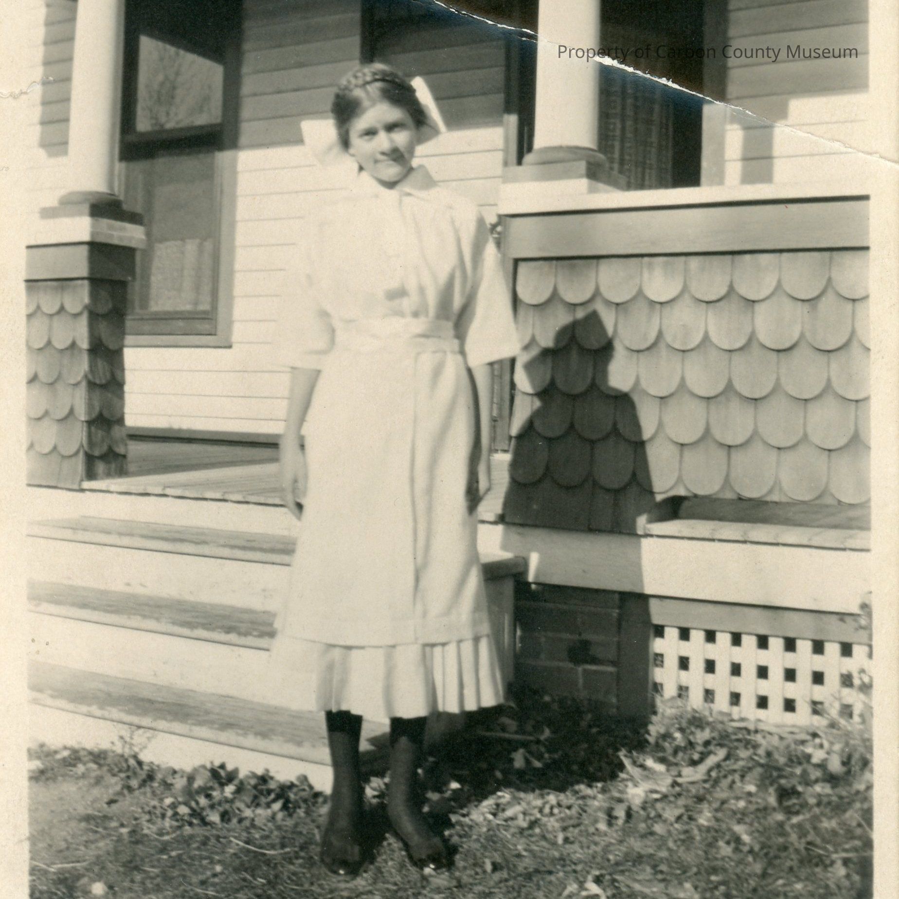 Update - 2009: Black & white print. Snapshot. Image of a young woman standing in front of the porch of a clapboard house. Sides of porch covered with v-shaped shingles. Woman wearing calf-length white dress with 3/4 length sleeves, dark tights &shoes & white apron. Her hair is pulled back with a large white bow.