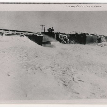 Black and white glossy reprint 3 1/2 x 5, of a wrecked train caught in the blizzard of 1949. A massive drift is piled up against a box railroad car to the roof on photo left. Photo center shows a few overturned cars? with parts exposed. Receding into right side of photo are more upright train cars, a truck, and a dark figure standing by the truck rear.