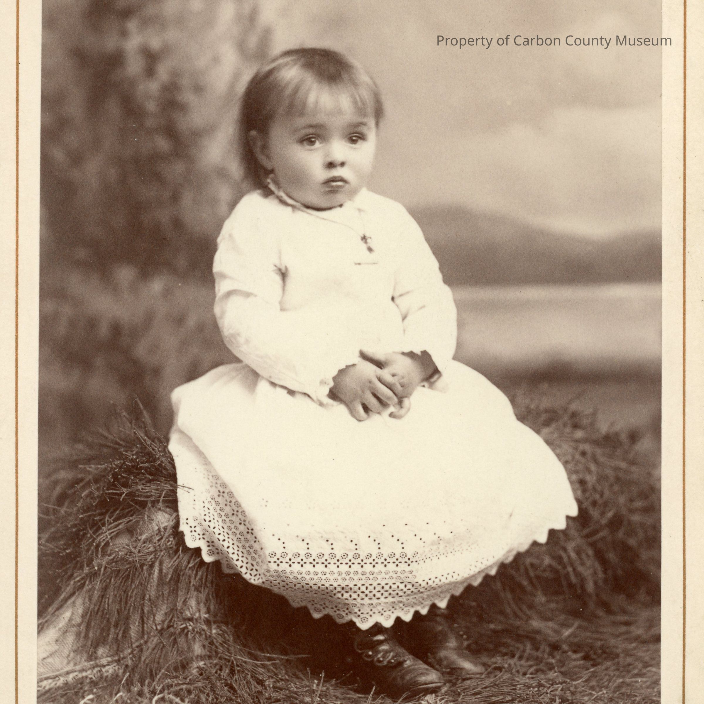 Update - 2009: Sepia print. Studio portrait. Mounted on off-white matboard. Full length portrait of a young child in a white dress with lace trim on skirt & dark button shoes. Child is seated on furs in front of a painted backdrop. Child's hands are in his/her lap.
