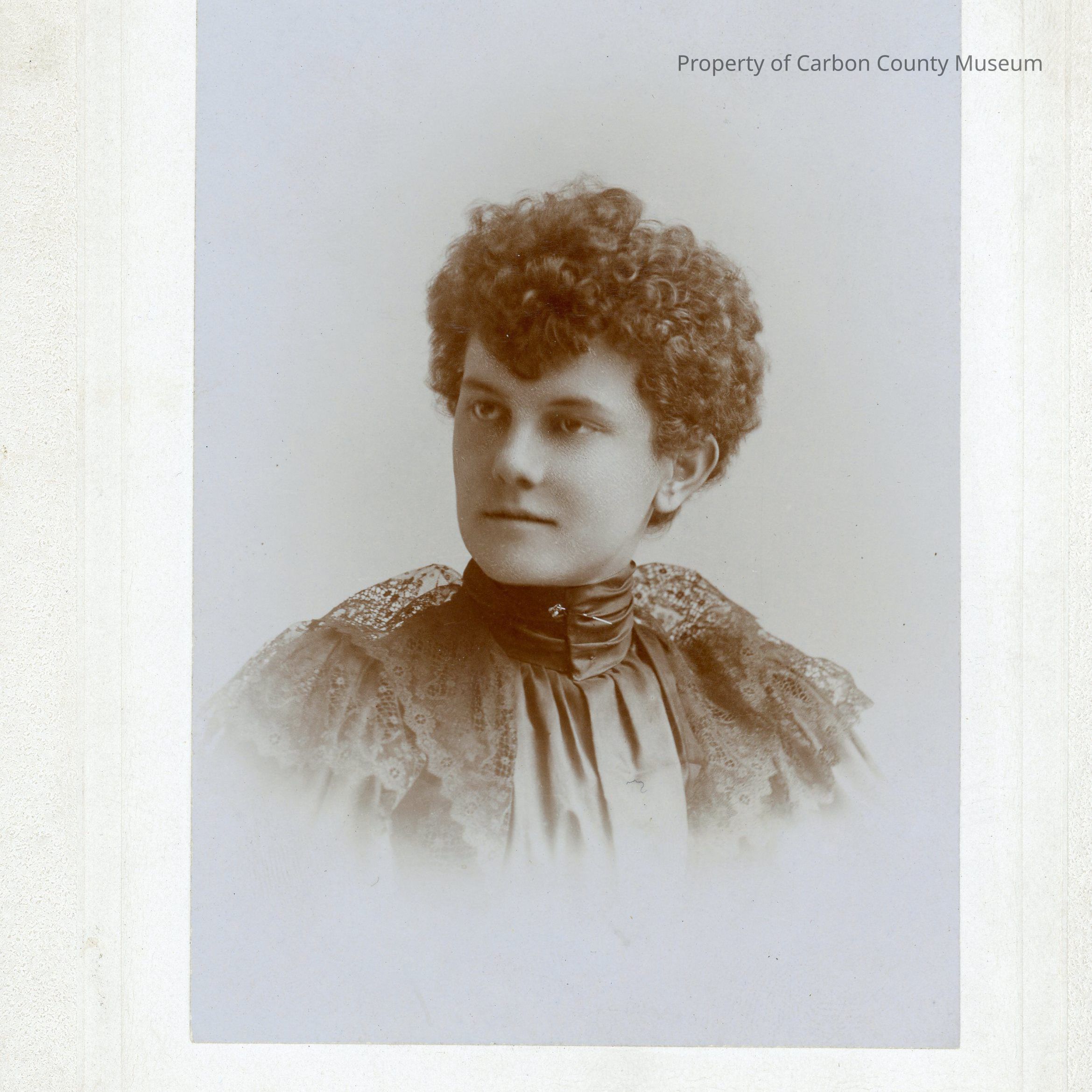 Image is of young woman with dark short curly hair, dark eyes & wearing a high collared dark blouse with soft pleats around neck & bodice portion. There is a dark lace overlay with it's own wide collar & open edges over the blouse.