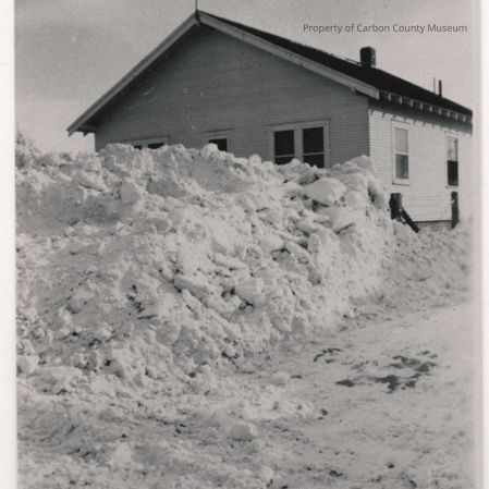 Black and white glossy reprint 3 1/2 x 5, of a white wooden building, house? with dark roof and pole attached to the apex of roof angle extending to photo edge. Household has a square chimney located at center back. A large pile of snow is in front of building with area to right of area plowed and showing remaining snow and patches of bare ground. There is a wire fence strung between two thick wood posts at photos right side . Snow is a result of blizzard of 1949.