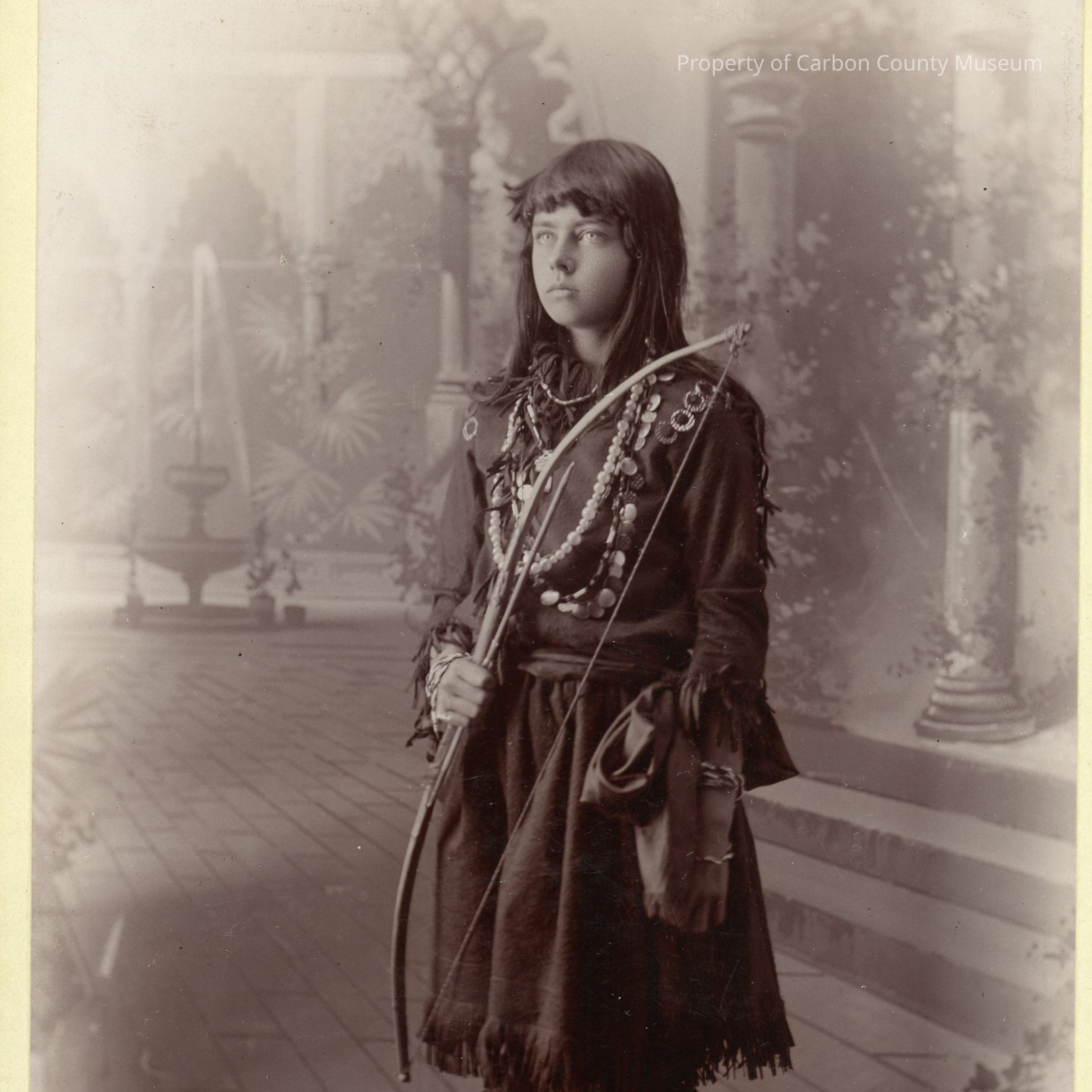 Update - 2009: Sepia print. Studio portrait. Mounted on yellow matboard with gilt edge. Full length portrait of a young woman standing on furs(?) in front of an ornately painted backdrop with columns & a fountain. Woman is dressed in dark fringed leather dress & leggings, beaded moccasins & several necklaces. She is holding a bow & arrow & has a bag tied to her waist. She is wearing several bracelets. She has dark hair & very light eyes.