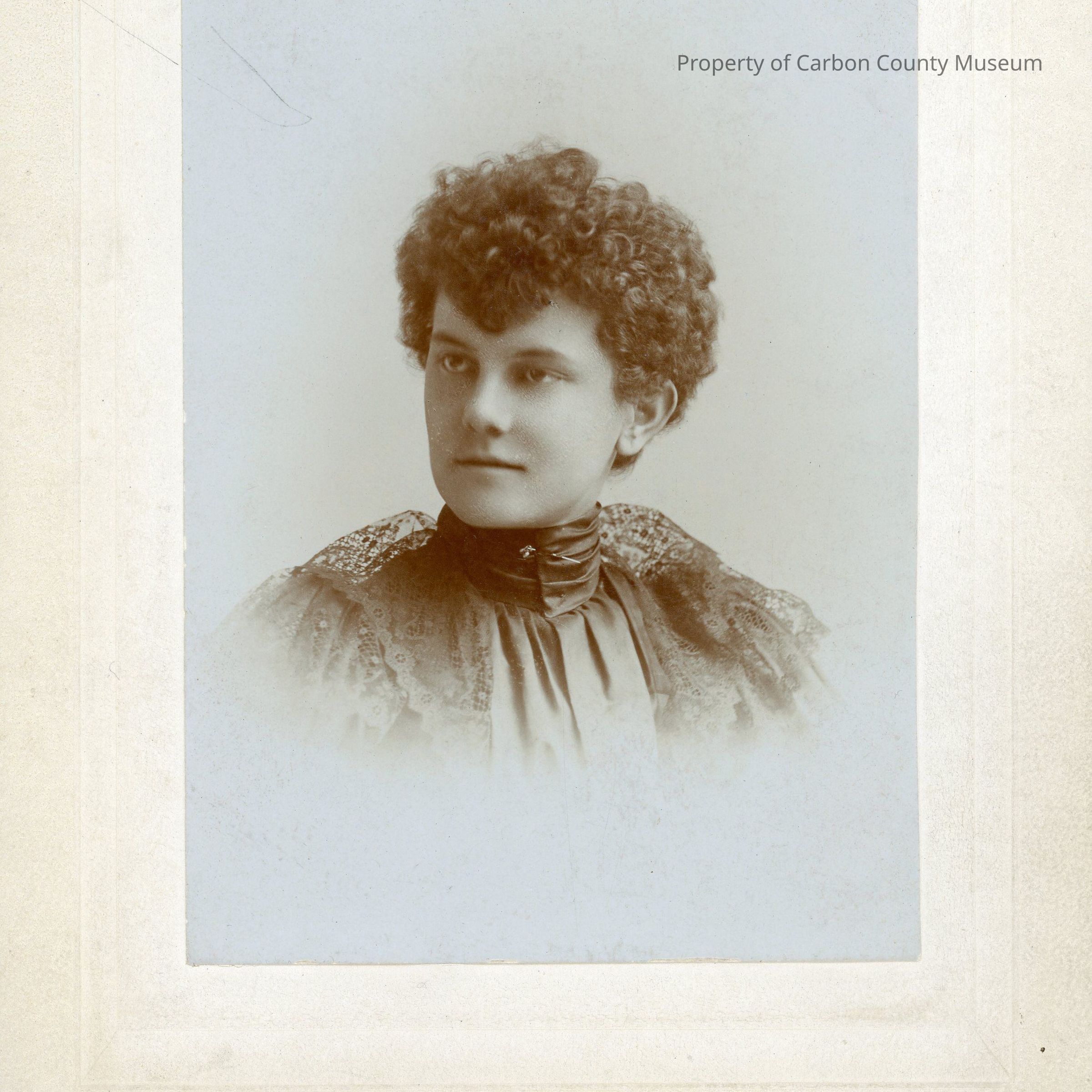 Image is of young woman with dark short curly hair, dark eyes & wearing a high collared dark blouse with soft pleats around neck & bodice portion. There is a dark lace overlay with it's own wide collar & open edges over the blouse.