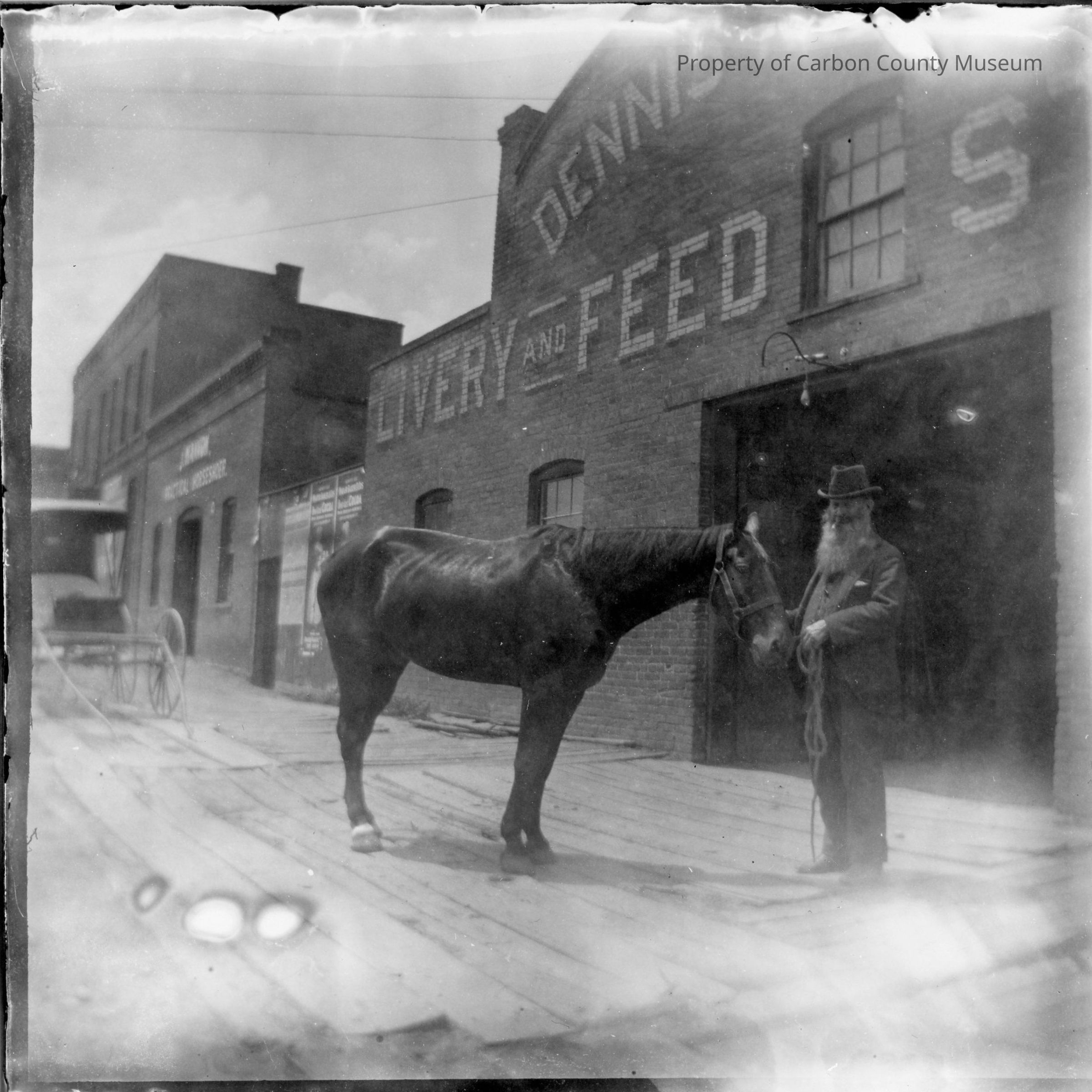 Horse and long white bearded man in front of Dennison Livery in Rawlins. One copy