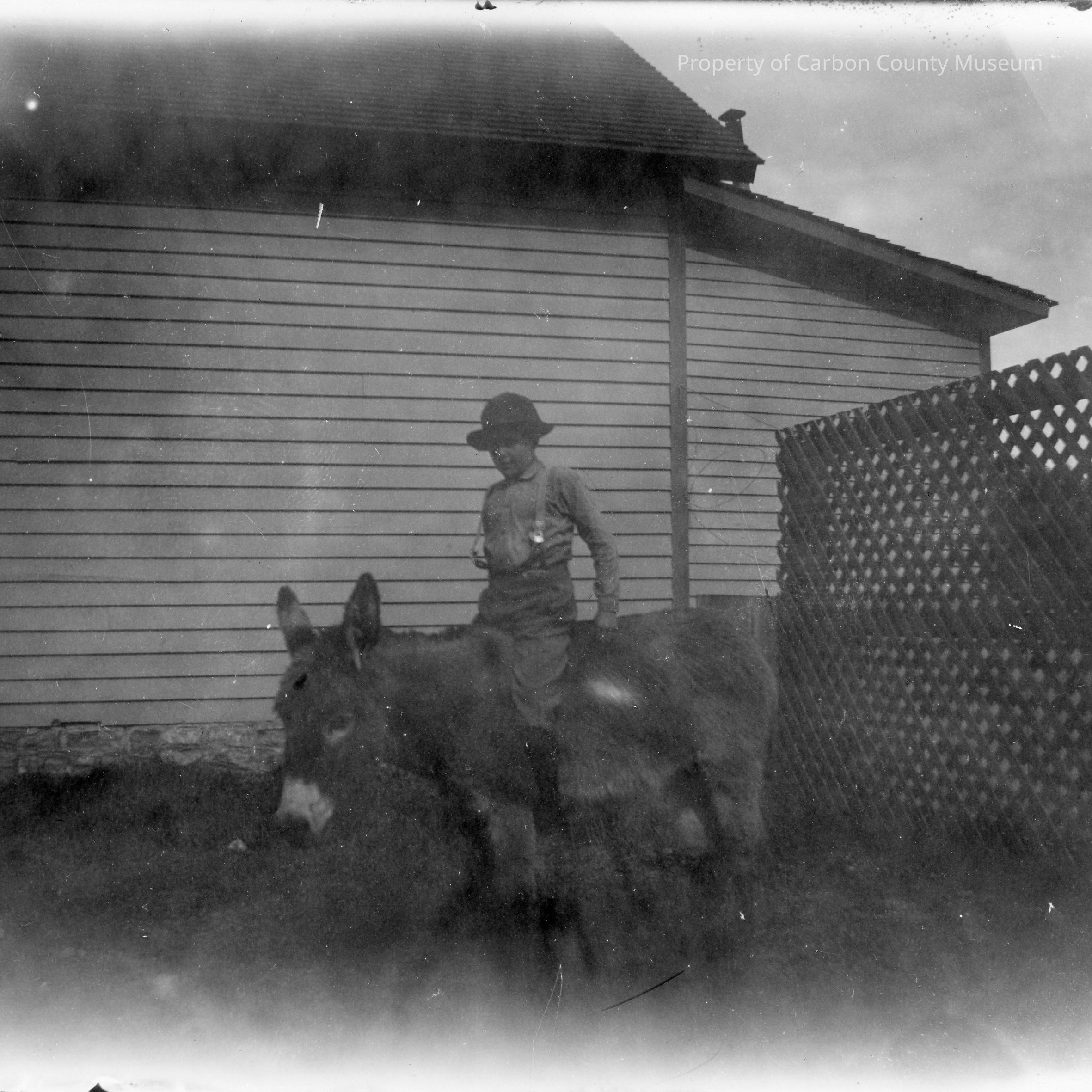 Update - 2009: 2 black & white contact prints. Snapshot. Made from glass plate negative, Box #10, 94. Image of a boy riding a burro. boy is wearing dark pants, suspenders, long-sleeved shirt & hat. clapboard building in background. lattice fence at right.