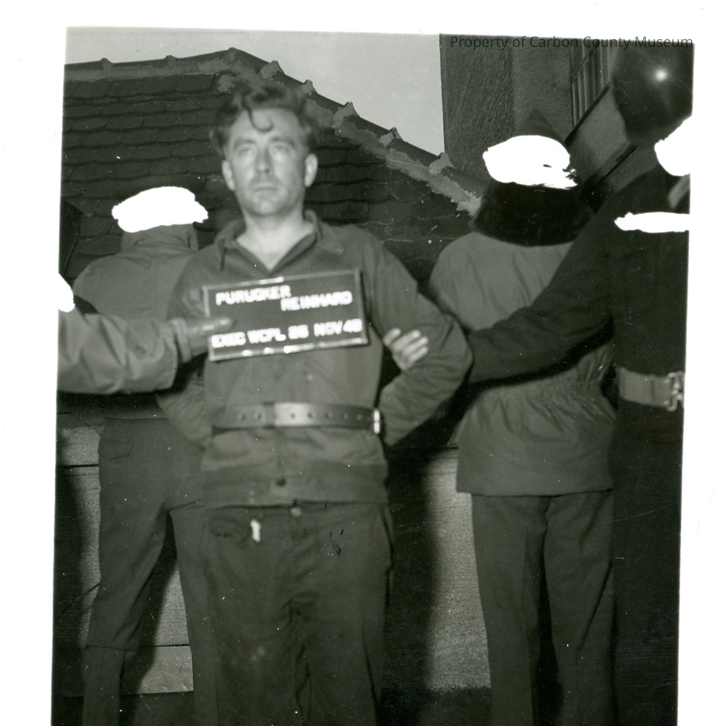 Black and white photograph. A man wearing a prisoner uniform is held in place by a man wearing a military uniform, his face and rank have been scratched out. A second man is also holding the prisoner in place, he is out of frame. Behind the three are two men in military uniform with their backs to the camera, their heads have been scratched out. A placard held in front of the prisoner reads "Purucker Reinhard EXEC WCPL 26 NOV 48".