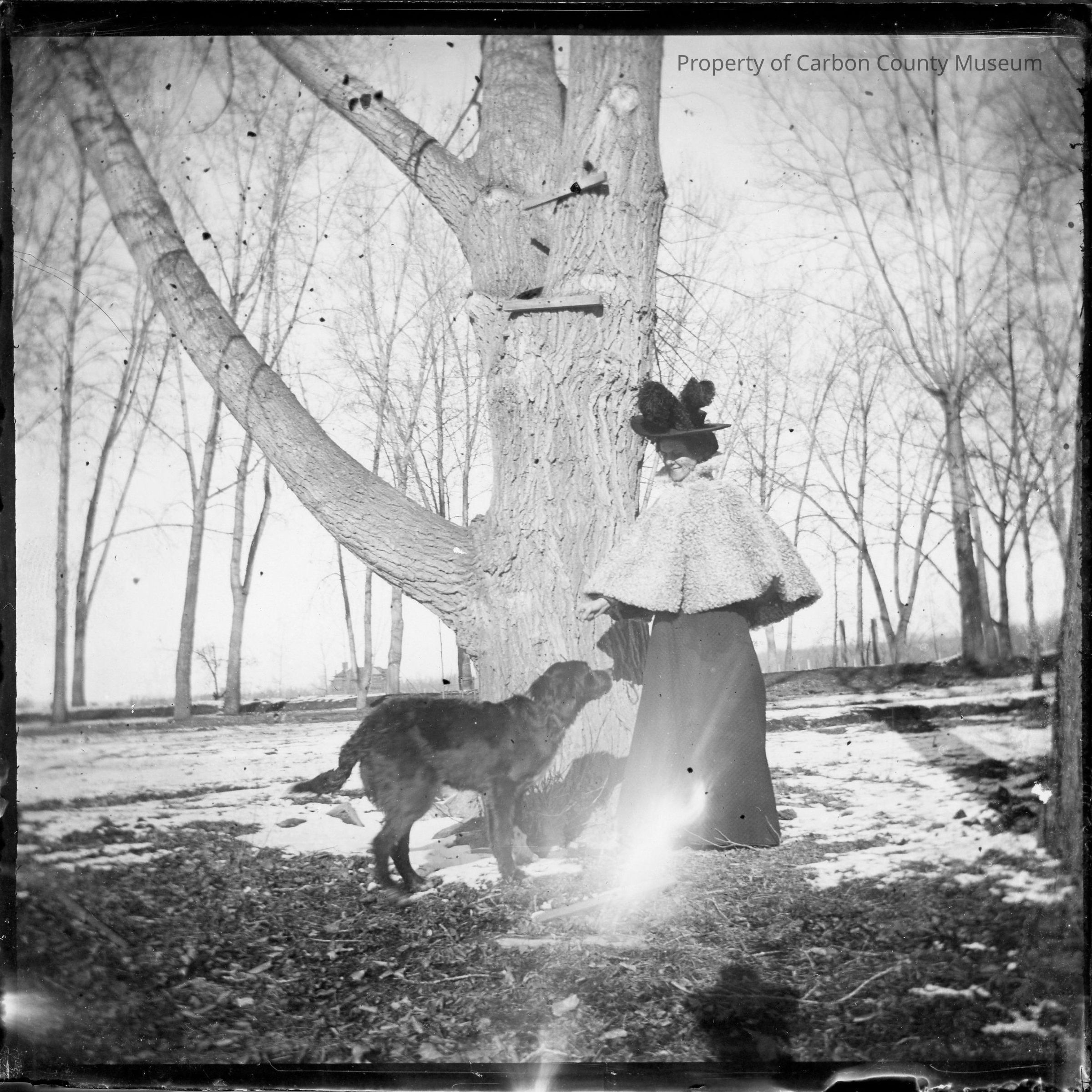 Update - 2009. Black & white contact print. Snapshot. Made from glass plate negative, Box #7, 59. Image of a woman wearing a dark skirt/dress, woolly cape & dark plummed hat, standing by a large tree. Dark dog standing in front of woman. Open space & more bare trees in background. Light spash at woman's feet.
