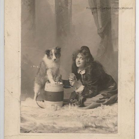 Sepia print. Studio pose. Mounted on tan matboard. Image of a young woman kneeling. Left elbow on knees, next to a painted keg with small dog perched with front feet on top. Woman is holding dogs forefoot in right hand and a tin cup in her left hand. A second tin cup is on the ground in front of the keg. Painted backdrop in background, furs on floor. Woman is wearing a dark skirt and jacket over a white blouse and has a hat? on the back of her head. Her dark hair is loose and curly. There appears to be an umbrella cane or riding crop in her lap. Leather strap attached to left side of keg.