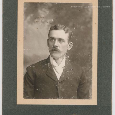 Black and white print. Mounted on green matboard. Studio portrait. Head and shoulders image of a man dressed in a dark suit, white shirt, white tie. He has short wavy hair and sports a mustache. Painted backdrop behind.