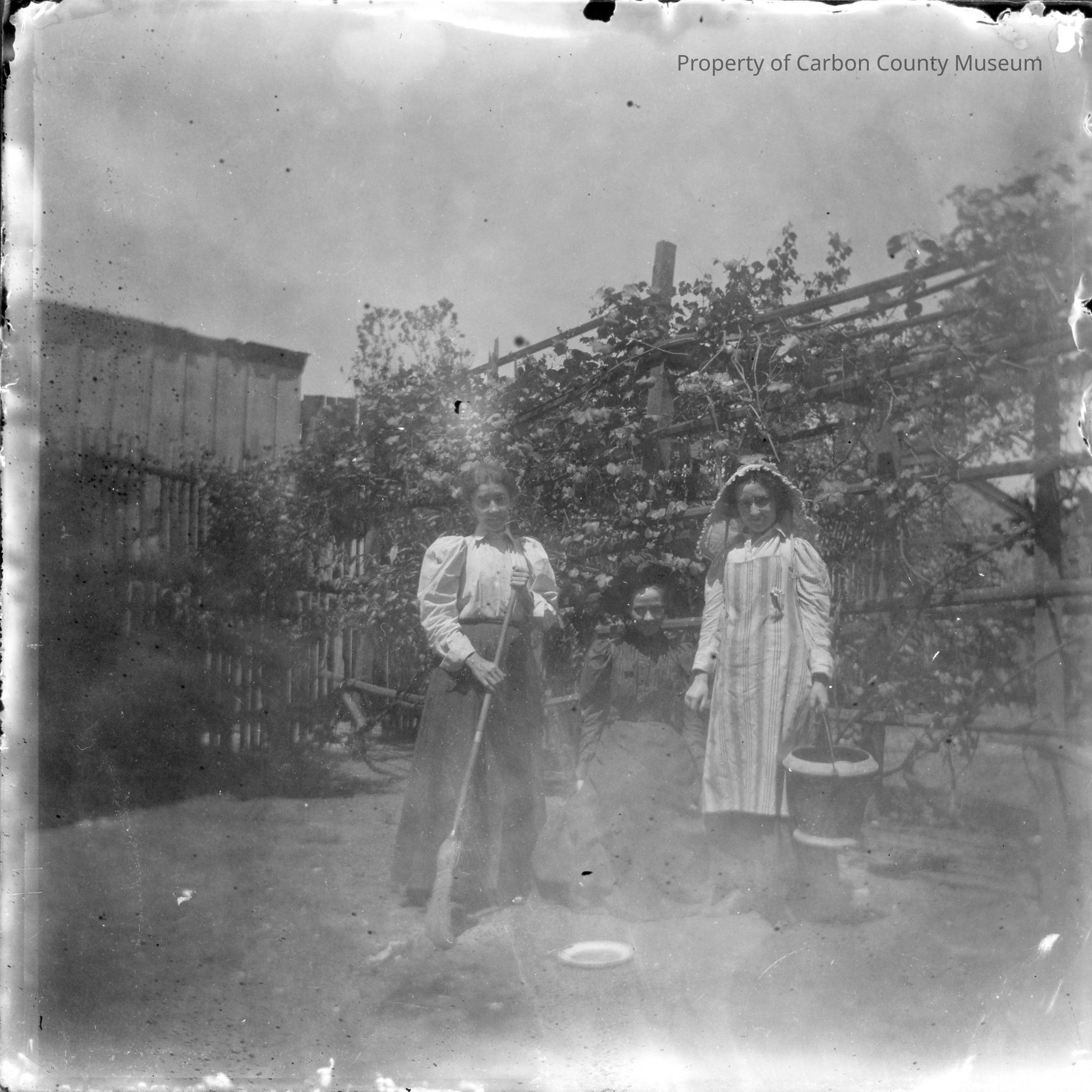 Update - 2009: Black & white contact print. Snapshot. Made from glass plate negative, Box "2, 18. Image of three women working in a yard. Wooden trellis with vines behind & at left with structure in background at left. Woman on right is dressed in striped sack dress & bonnet & is holding a large bucket. Woman at center is seated; she is wearing a long dark dress & hat. Woman at left is dressed in long dark skirt & long sleeved light-colored blouse; she is holding a broom. Plate on the ground between the women. Irregular lighting - damage from original negative.