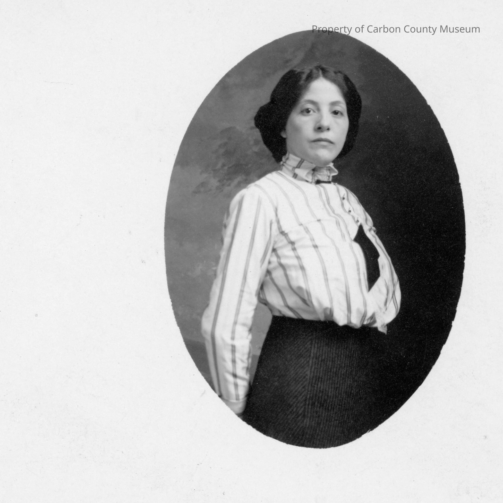 Update 2008: Black and white print. Oval print of a lady standing. She has on a light colored striped long sleeved blouse which buttons all the way up the front. Halfway down the front appears the tail end of a dark scarf. The neckline is high and tight fitting. The skirt is dark. The lady appears to have her arms and hands behind her back . She has her hair parted in the middle and combed back in a bun?
