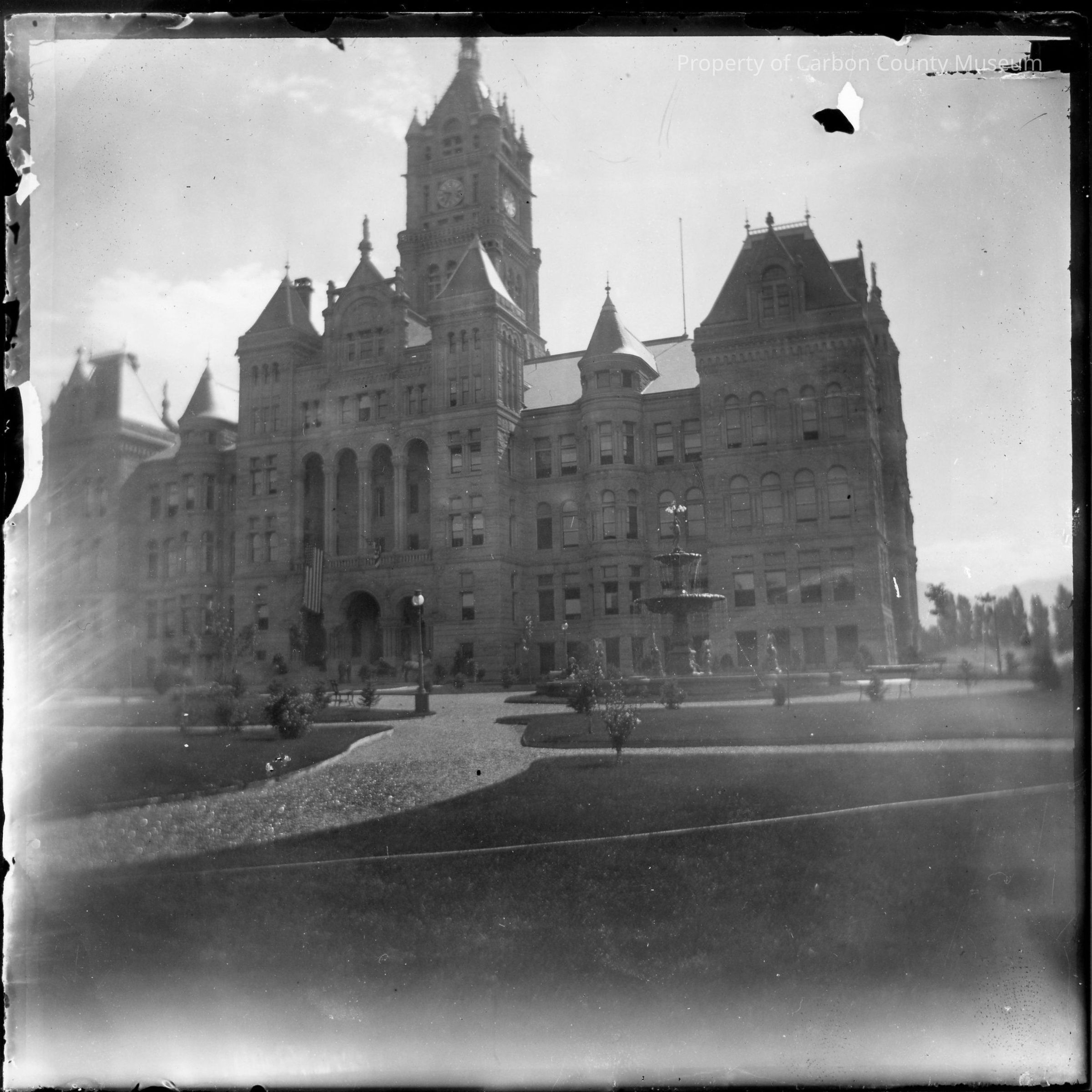 Update - 2009: 2 black & white contact prints. Snapshot. Made from glass plate negative, Box #5, 40. Image of a large multi-story stone building with towers & turrets in its varied roof line. Large lawn with walkways & large 2-tiered fountain in front.