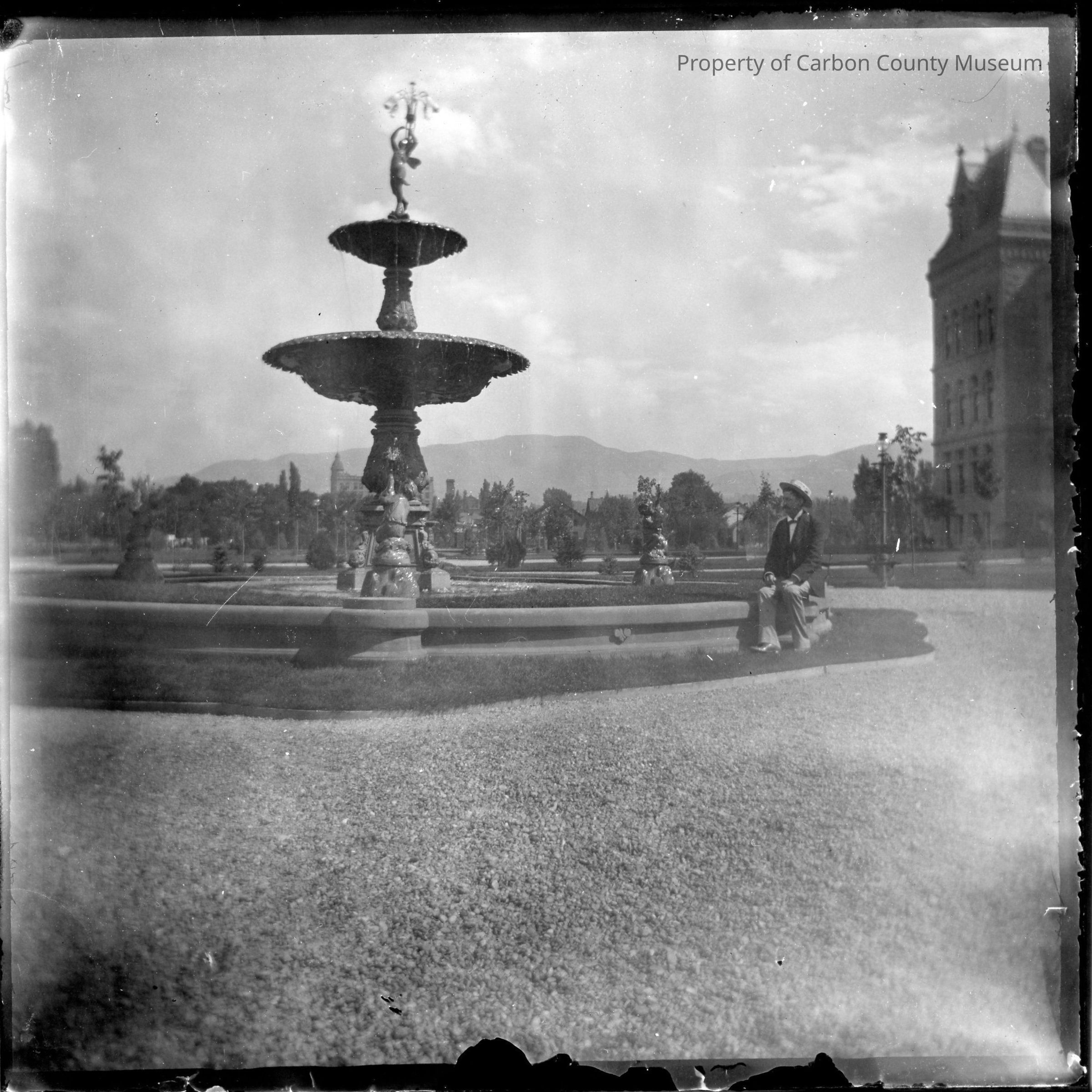 Update - 2009: 2 black & white contact prints. Snapshot. Made from glass plate negative, Box #5, 36. Image of a man sitting on the edge of a large 2-tiered fountain with an angel finial. Large building in background right. Trees & mountains in background. Man is wearing light slacks, dark suit jacket & hat.