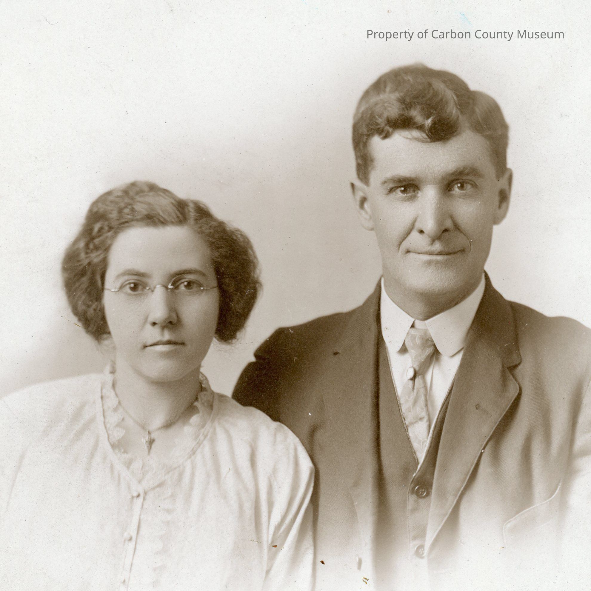 Update 2008: Sepia print. Studio portrait. Printed on postcard paper. Head and shoulders portrait of a man and woman. Woman is wearing a white long-sleeve dress with button front bodice with lace at nick and front placket; her hair is short or pinned up; she is wearing glasses and a necklace with triangular pendant. Man is dressed in suit with vest white shirt and patterned tie, oval stick pin at knot of tie; hair is short and wavy.