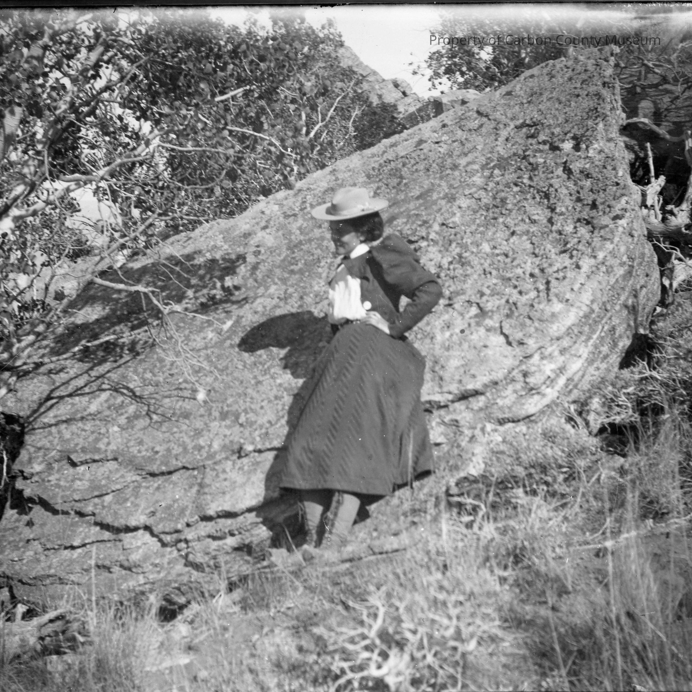 Update - 2009: Black & white contact print. Snapshot. Made from glass plate negative, Box # 10, 93. Image of a woman standing next to a large standing boulder. Trees & bushes all around. Woman dressed in calf-length, dark skirt & jacket, white shirt, hat & lace-up boots. she is standing with her left hand on her hip & looking off to the left side of the image.