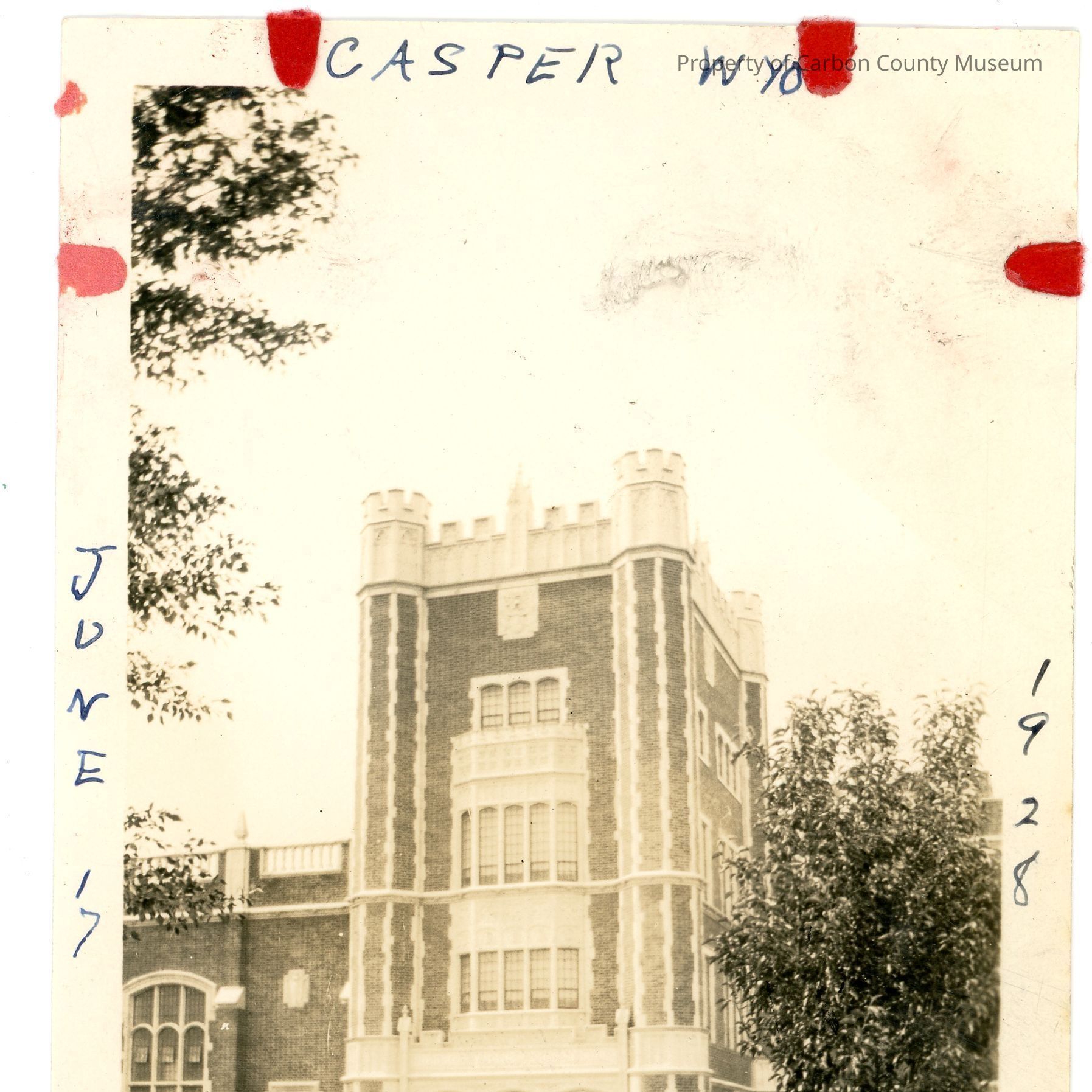 Sepia tone photograph. The front entrance to a three-story, brick building, a man is standing behind a bush. Written along the top edge of the photograph is "CASPER WYO", along the bottom "ENTRANCE TO N.C.H.S.", vertically along the left "JUNE 17", vertically along the right "1928". The number 15 is printed on the reverse, also present is a circular green stamp that reads "MEYERS PHOTOS PHOTO FINISHING RAWLINS, WYO".Collection