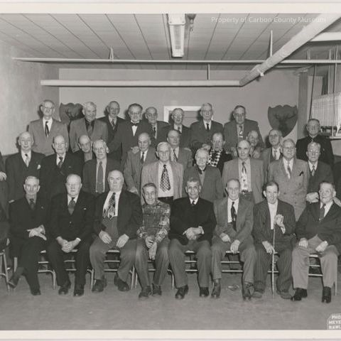 Black and white print. Snapshot. Mounted on tan patterned matboard. Image of a large group of older men, seated and standing in a small basement? room. Suspended pipes cross the ceiling; a radiator can be seen in the background at right. All but one man are dressed in suits. Single man in overalls and plaid shirt in center front row. Plaques with Elk on wall at right and left background.