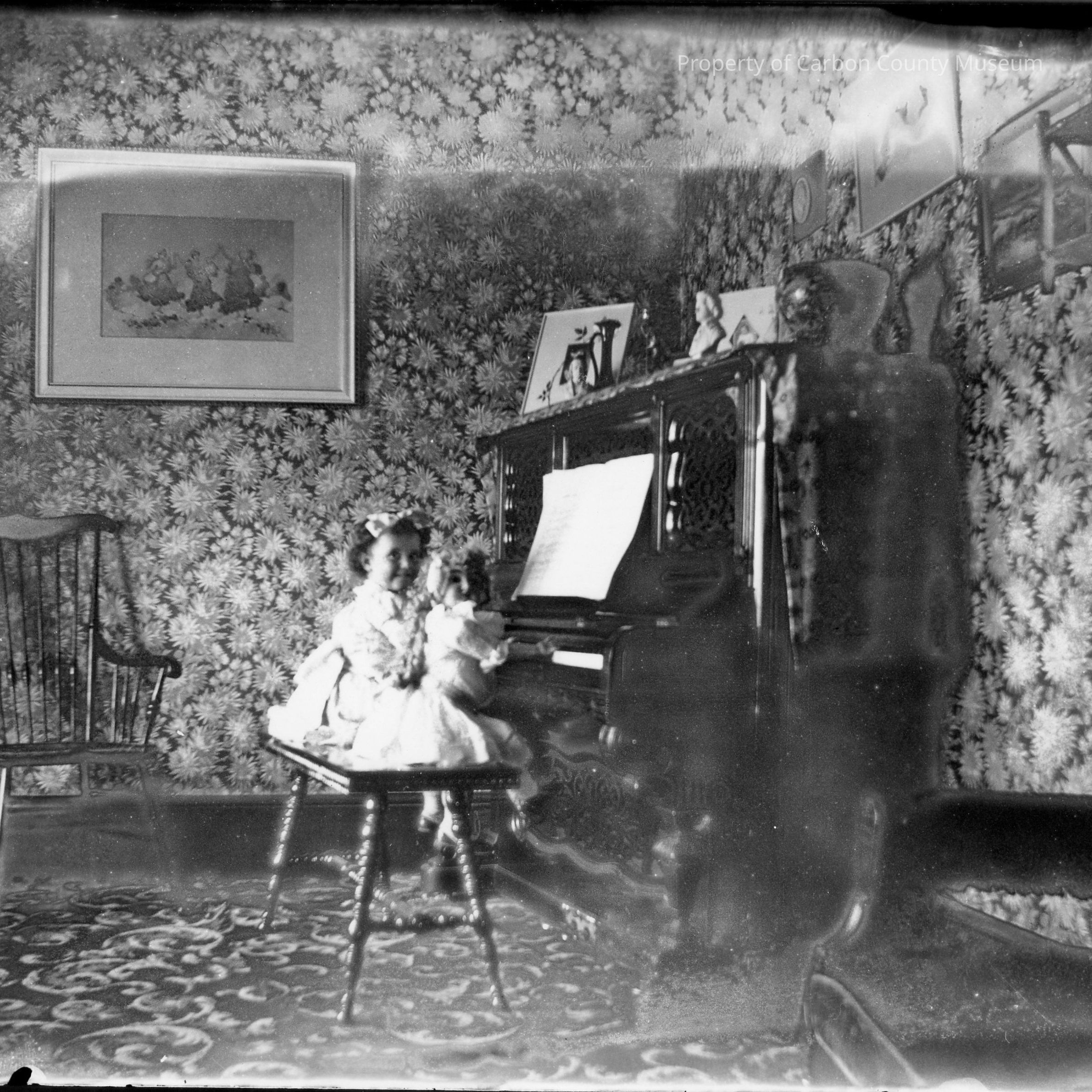 Update - 2009: 2 black & white contact prints. Snapshot. Made from glass plate negative, Box 12, 112. Image of a young girl & a large doll seated at an upright piano. Girl & doll are both dressed in white & both looking over their shoulders at camera. Sheet music on piano. Patterned cloth, photos & knicknacks on top of piano. Walls covered with loud floral wallpaper. Patterned carpet on floor. Pictures & a shelf mounted on walls. Wooden chair at left; upholstered chair in foreground right.