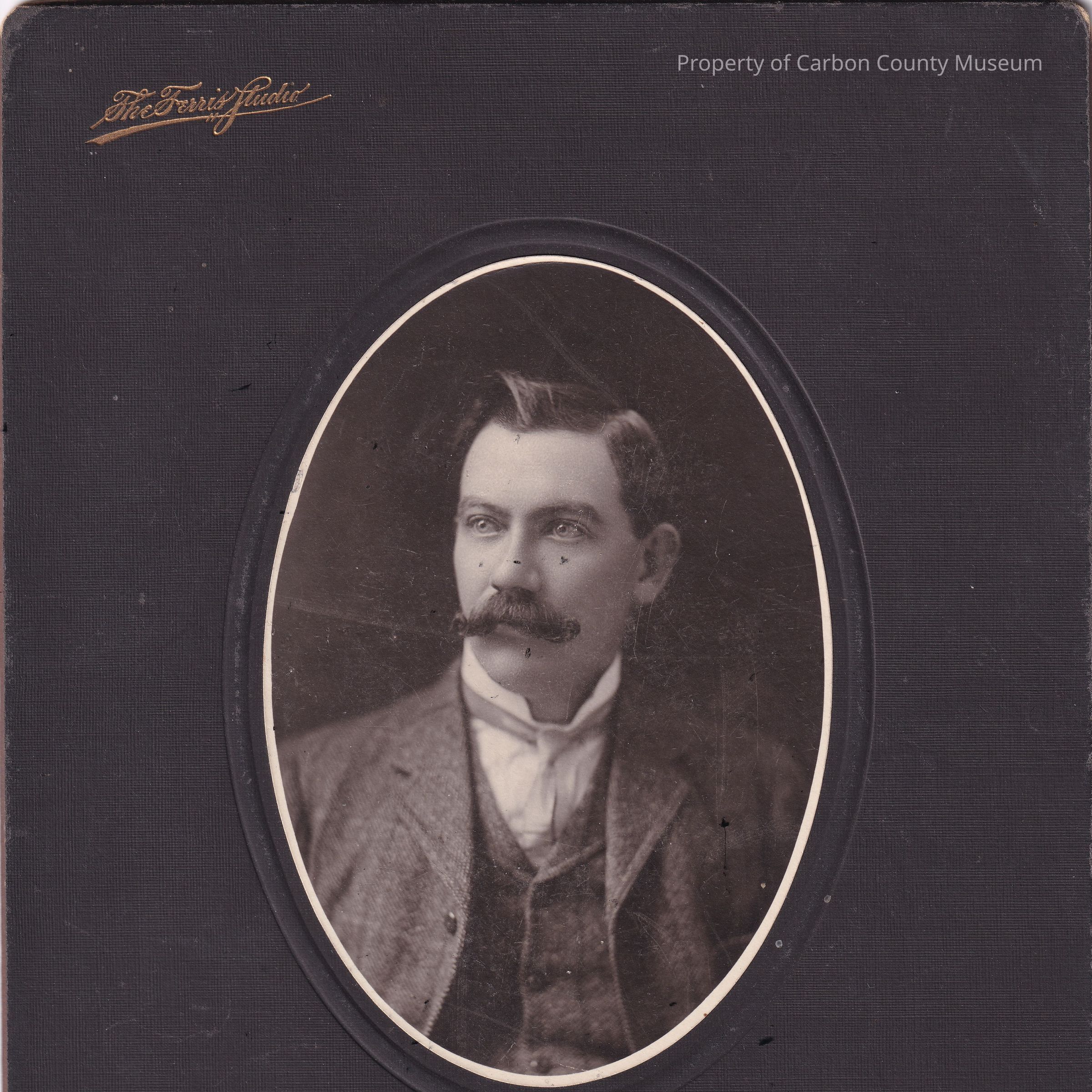 Cabinet card photograph, studio headshot of a man. The card has the words "The Ferris Studio" imprinted in it along with a logo that resembles a tipee over the words "Rawlins, Wyo."Collection