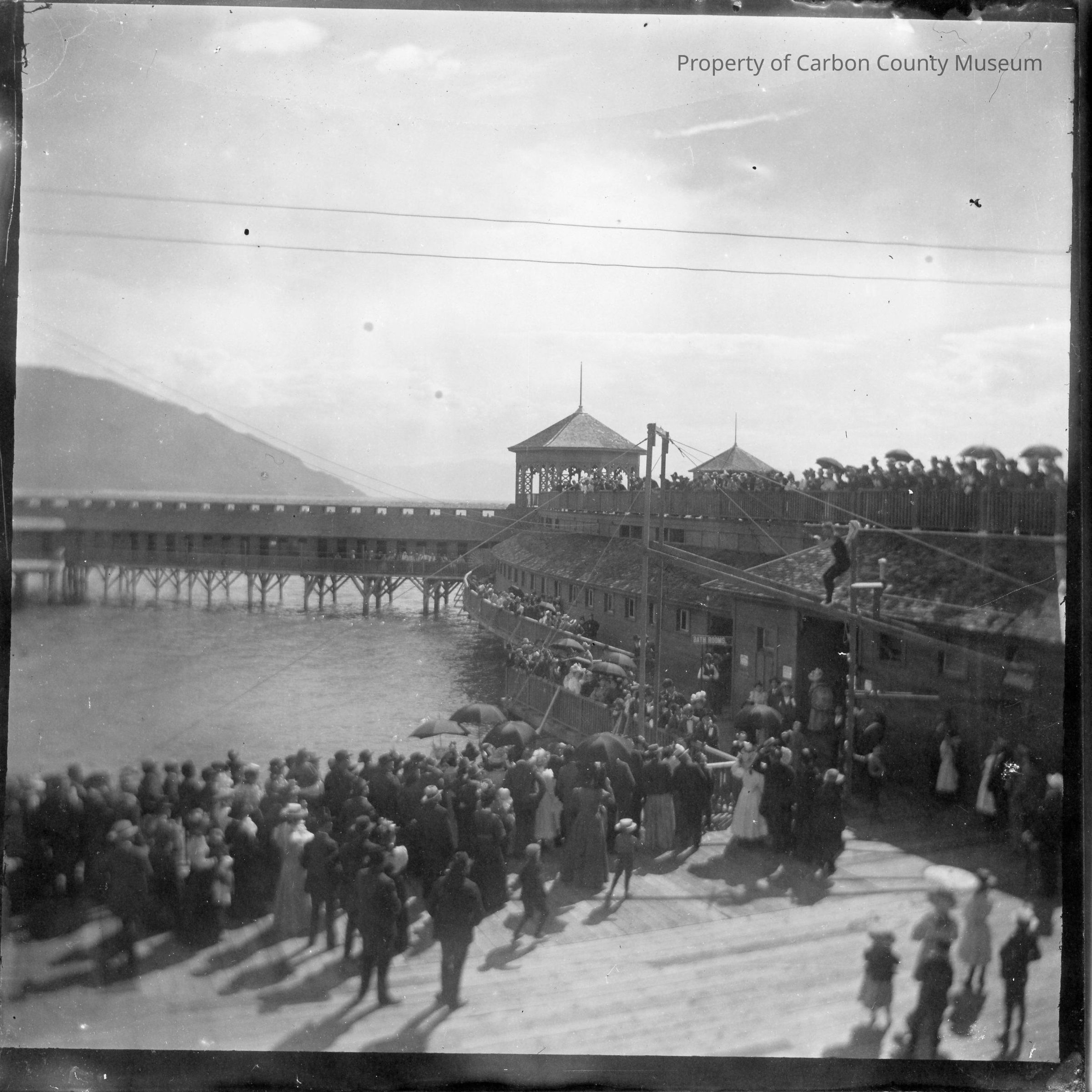 Update - 2009: 2 black & white contact prints. Snapshot. Made from glass plate negative. Box #5, 45. Image of a large group of people gathered at a large body of water. Covered pier, gazebos & other buildings in midground. Hill in background left. Appears to be an aerialist or tightrope walker performing at right.