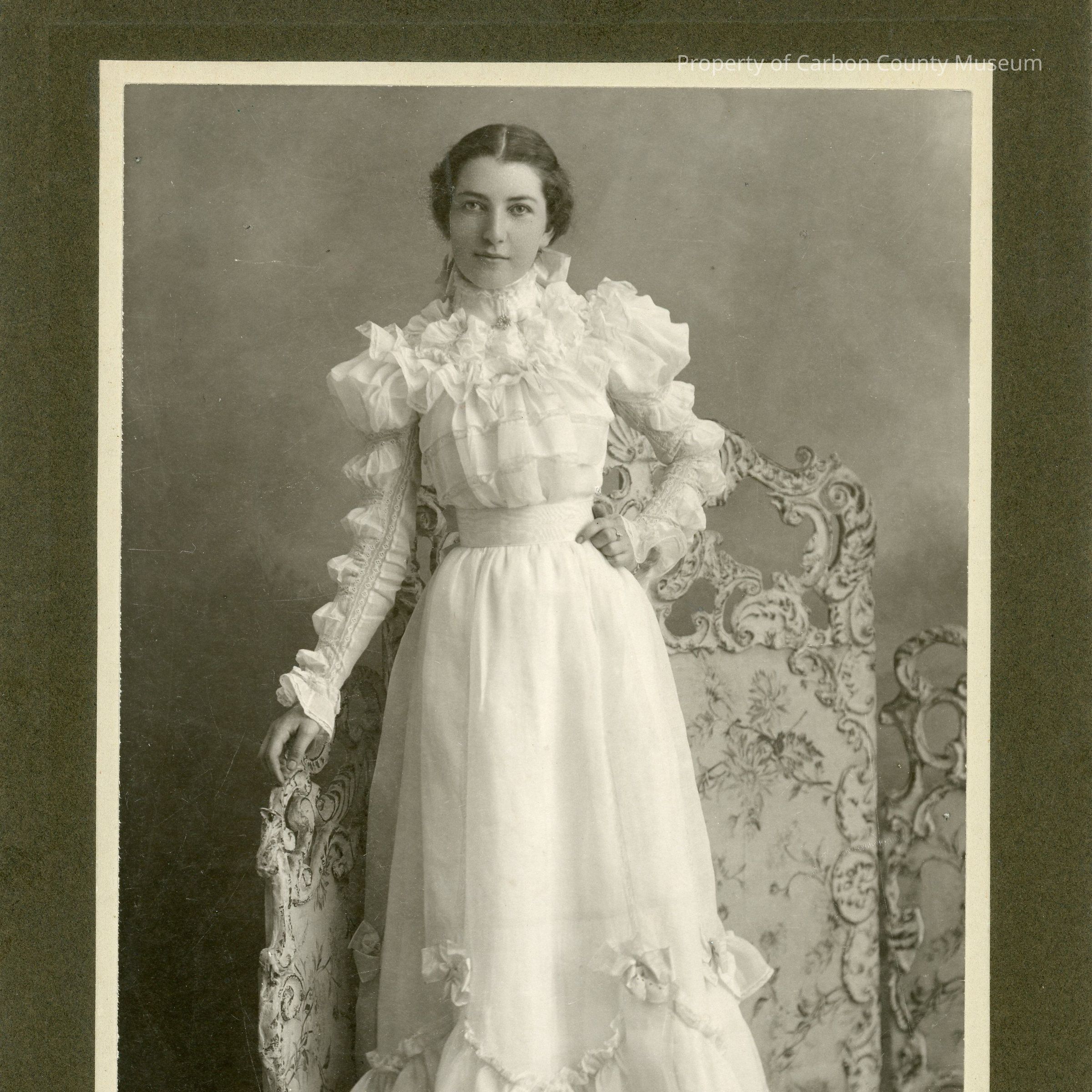 Print shows a young woman standing in front of an ornate floral printed screen. She has dark hair with a center part. Hair is pulled back from face. She is wearing a very frilly, long sleeved, high neck, long white dress. Sleeves and bodice have layers of ruffles and poufy tucks cascading down the bodice front and the sleeves at outer edges. Lower skirt has scallops with material rosettes at the top of the scallop. Lower ruffled edges have tiny lace boarder insets.