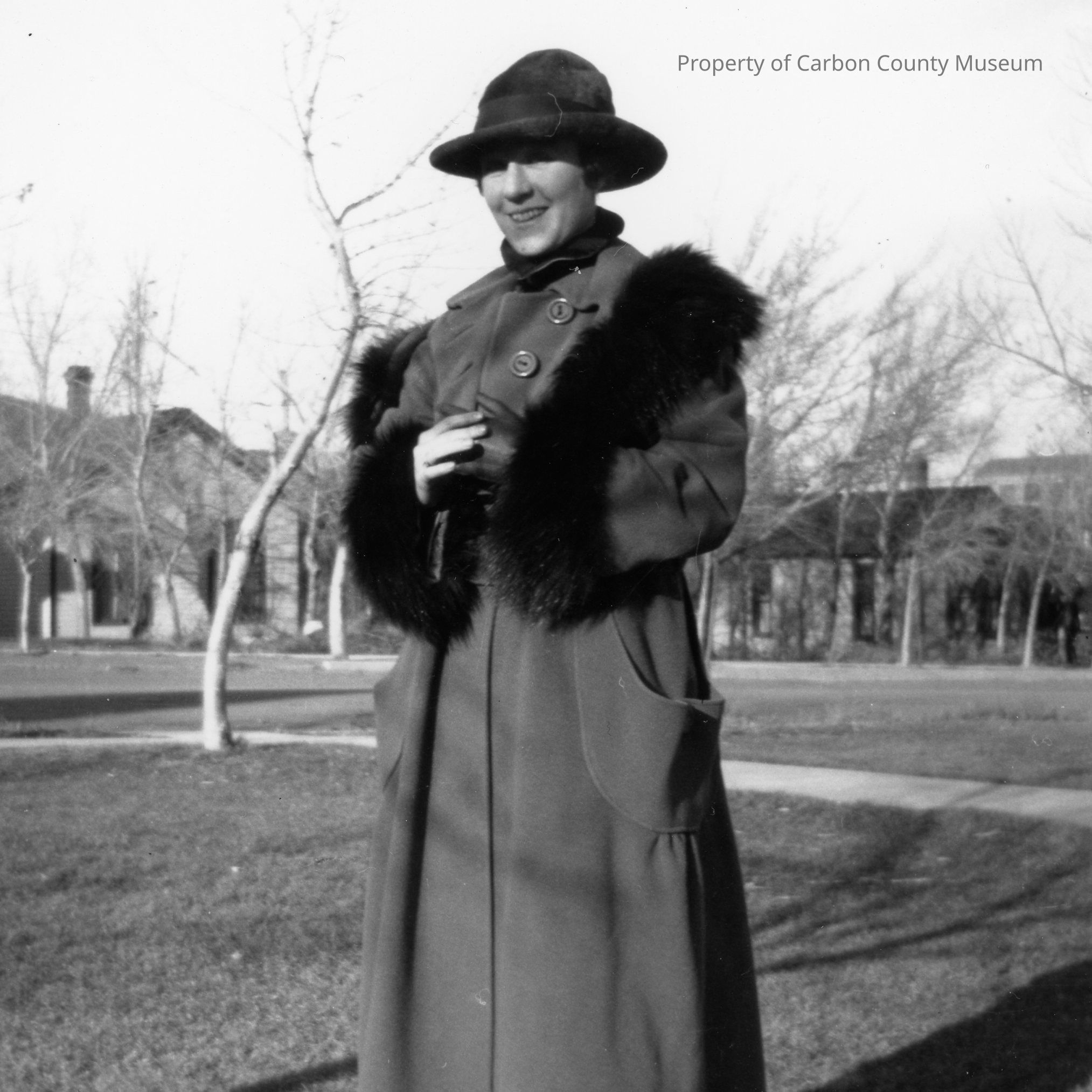 Update - June 2010: black & white copy print. Snapshot. Image of a woman dressed in a coat with fur cuffs & fur at shoulders. She has a dark glove on her left hand; her right hand is bare; she is wearing a dark hat. Woman is standing on a grassy lawn; trees, sidewalks & houses in background.Collection