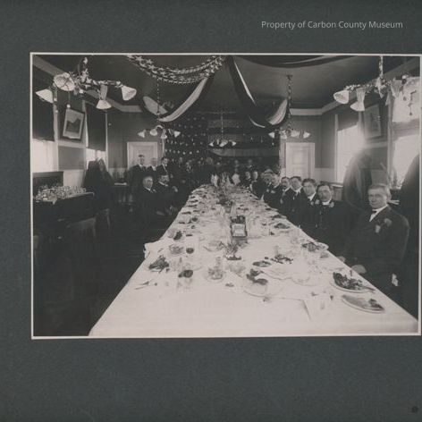 Written in pencil on yellow post it note on back: "Banquet given at Rawlins UPRR Depot Diner for the crew of American Thomas Flyer before noon Wed. March 11, 1908. This was Rawlins favorite in the New York to Paris 1908 Auto Race." In black ink: "Wed morning Mar. 11, 1908"